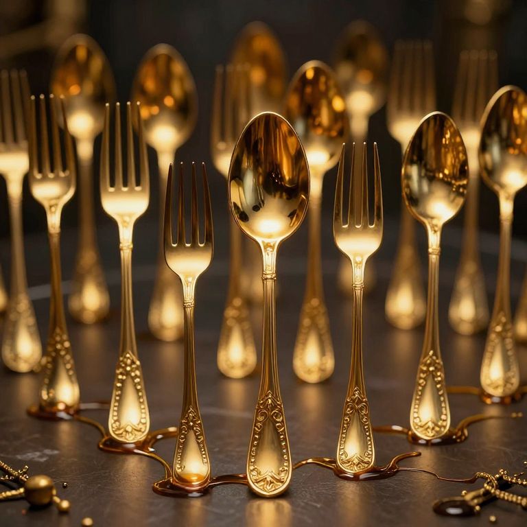 In a surreal, cyberpunk-inspired tableau, a golden army of ornate spoons stands united in protest against the tyranny of forks, their reflective surfaces gleaming under dramatic, high-contrast lighting, evoking a philosophical war fought in a kingdom where every law is inscribed in syrup.