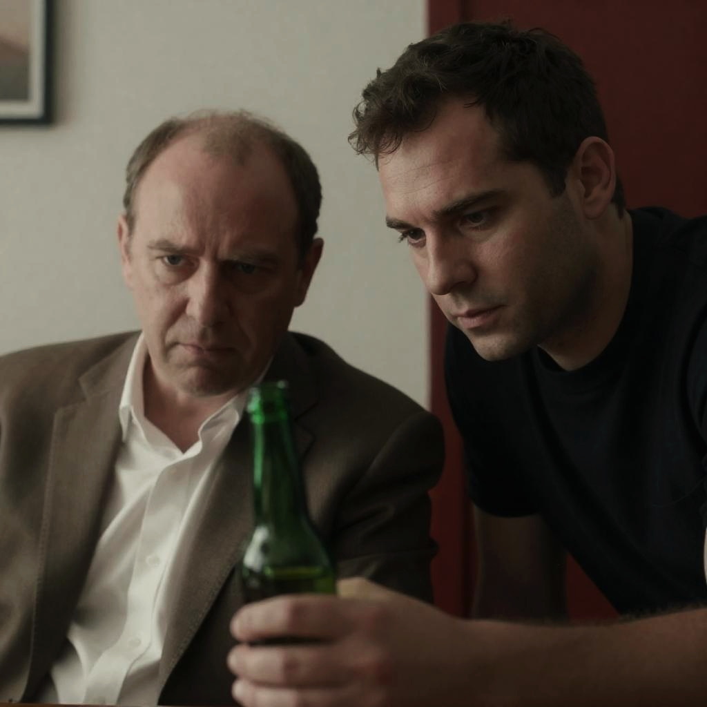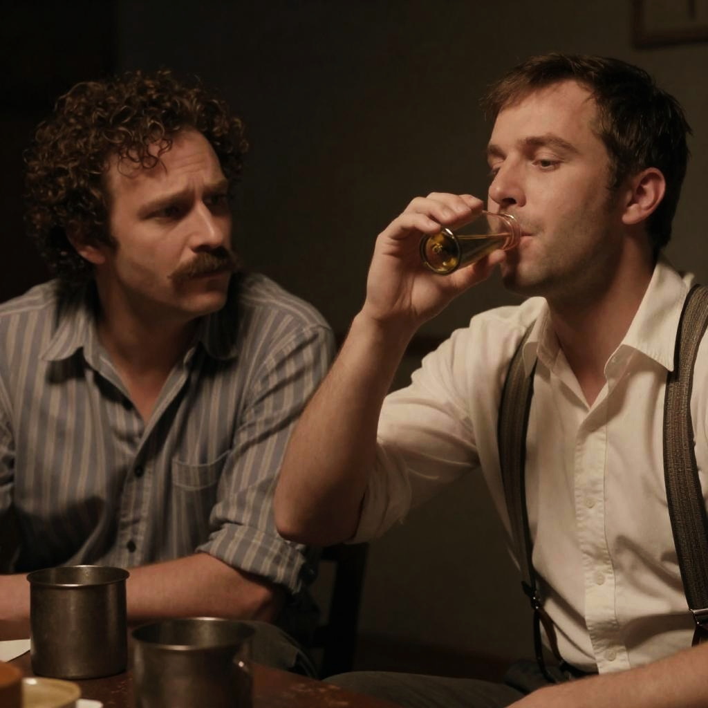 Photograph of two men in a dimly lit room. The man on the left has curly brown hair, a thick mustache, and wears a striped shirt. He looks at the other man with a concerned expression. The man on the right has short brown hair, is clean-shaven, and wears a white shirt with suspenders. He is holding a small glass bottle to his lips, drinking. The left man has a metal cup and a pot on the table. The background is dark and ured. Both men are focused on the bottle.