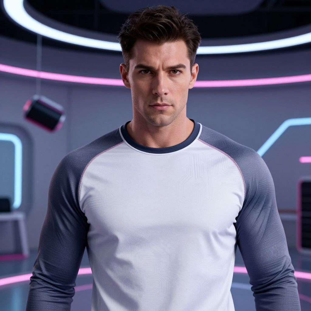 Photograph of a serious, muscular man with short dark hair, wearing a white and gray long-sleeve raglan shirt, standing in a futuristic
