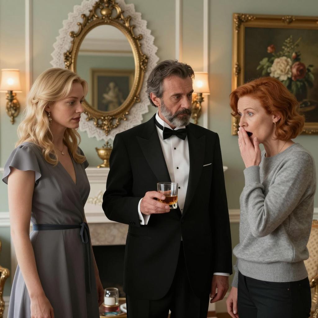 A formal party. Three people in focus. Man with patterned jacket, white rose, leaning over seated older man. Woman with red hair, black dress, silver necklace, holding champagne glass. Christmas tree, candles, balloons, and people in background. Seated man smiling, looking up at standing man. Woman's profile visible. Decorative curtains and ornate fireplace in background.