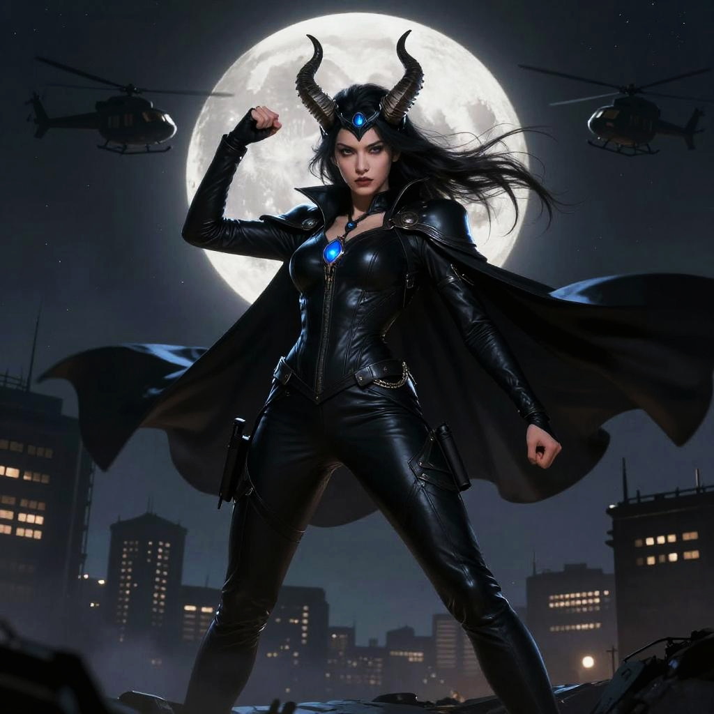 Enchantress DC costume, modern mystical outfit blending gothic and fantasy styles, emerald green and black color palette, magical glyphs floating around, standing on a rooftop overlooking a dark city skyline at night, dynamic composition, digital painting