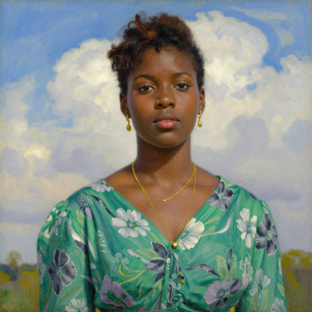 Photorealistic painting of a young Black woman with short curly hair, wearing a green floral dress and gold jewelry, against a bright blue sky with white