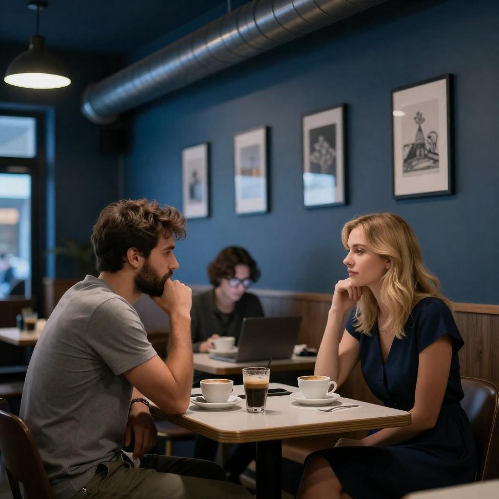 Black-and-white photograph of a busy café. A muscular man with short dark hair, wearing a sleeveless shirt, stands on the left, facing a counter with a bowl of grapes. In the background, a woman with curly hair and a striped shirt stands near the counter, surrounded by shelves and illuminated signs.