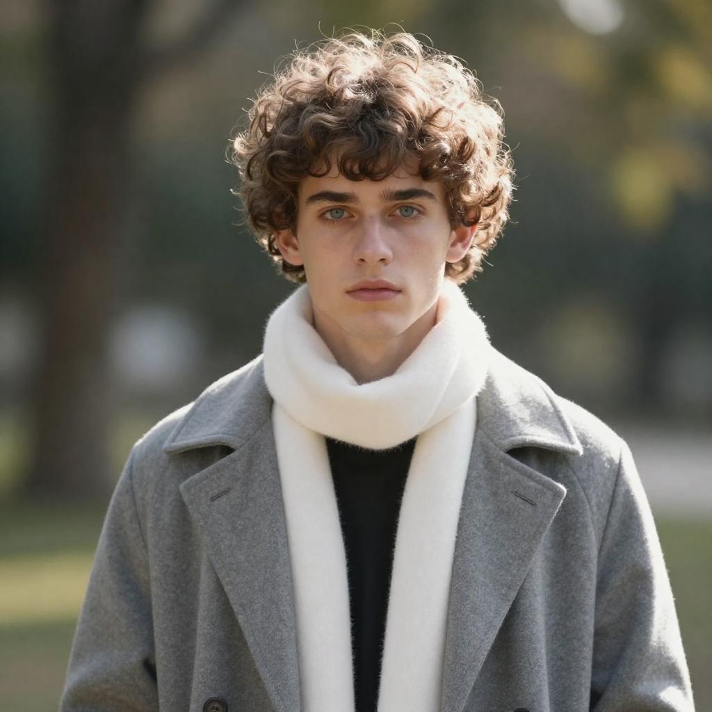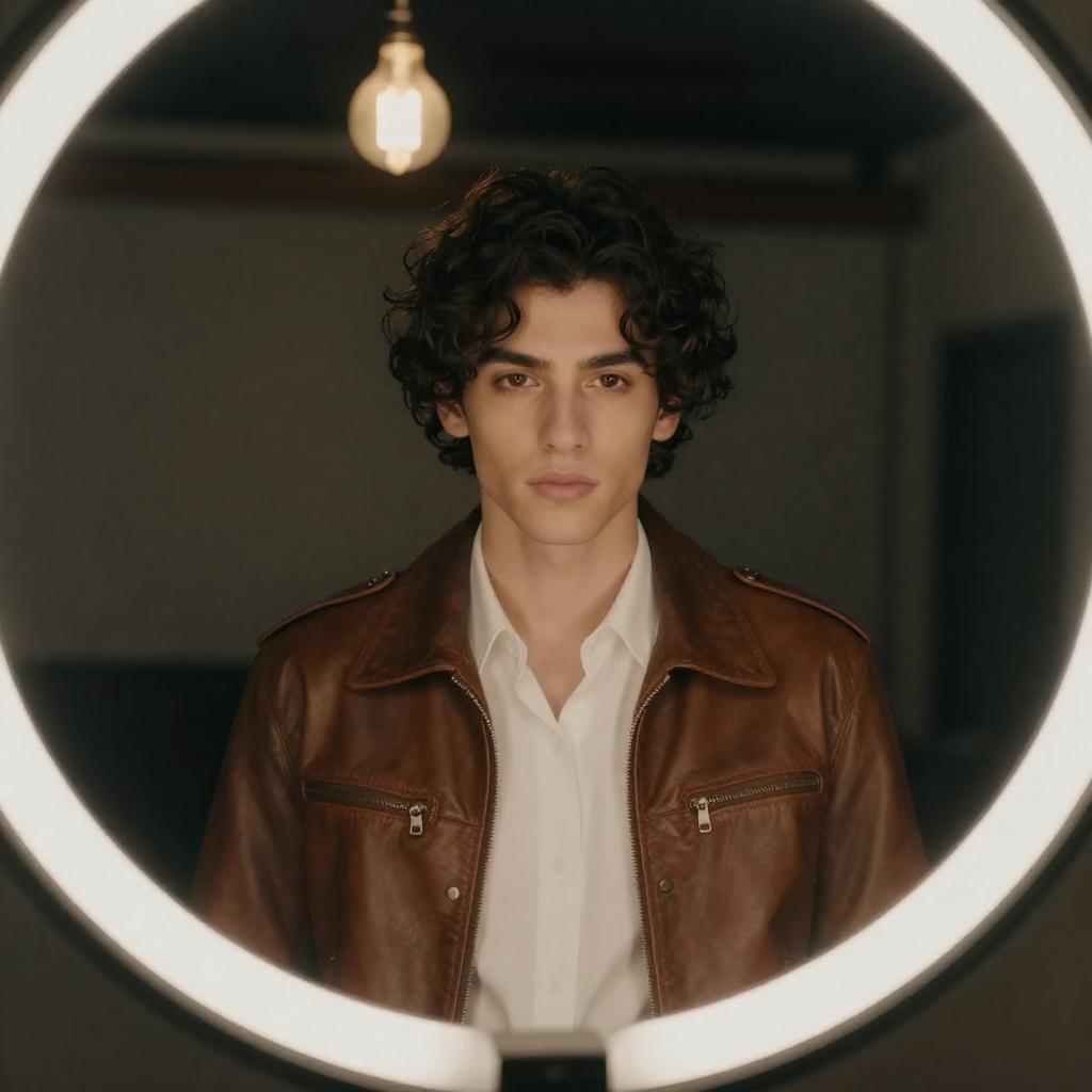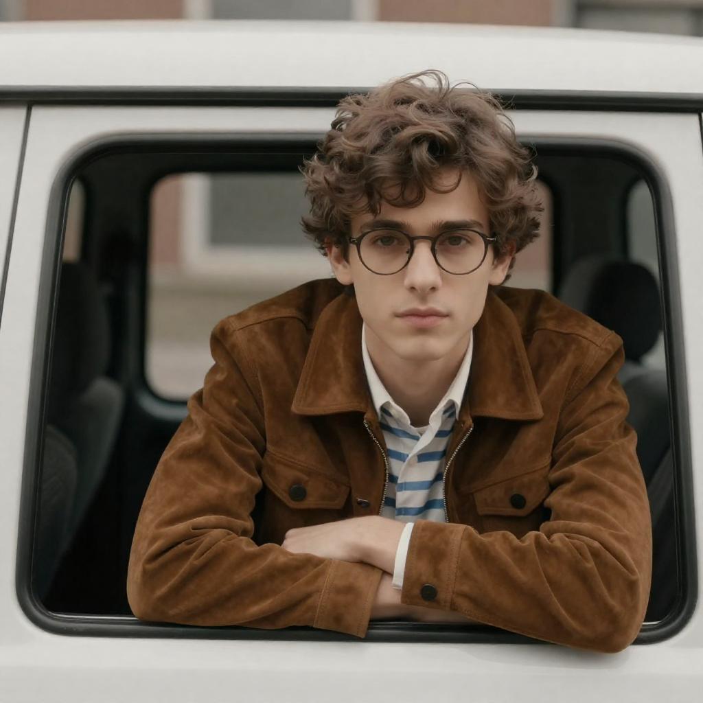 Photograph of a young man with wavy brown hair and glasses, wearing a brown suede jacket over a white and blue striped shirt, leaning out of a white car window. His right hand rests on the car's door frame, and his expression is serious. The background is blurred, with a hint of a building.