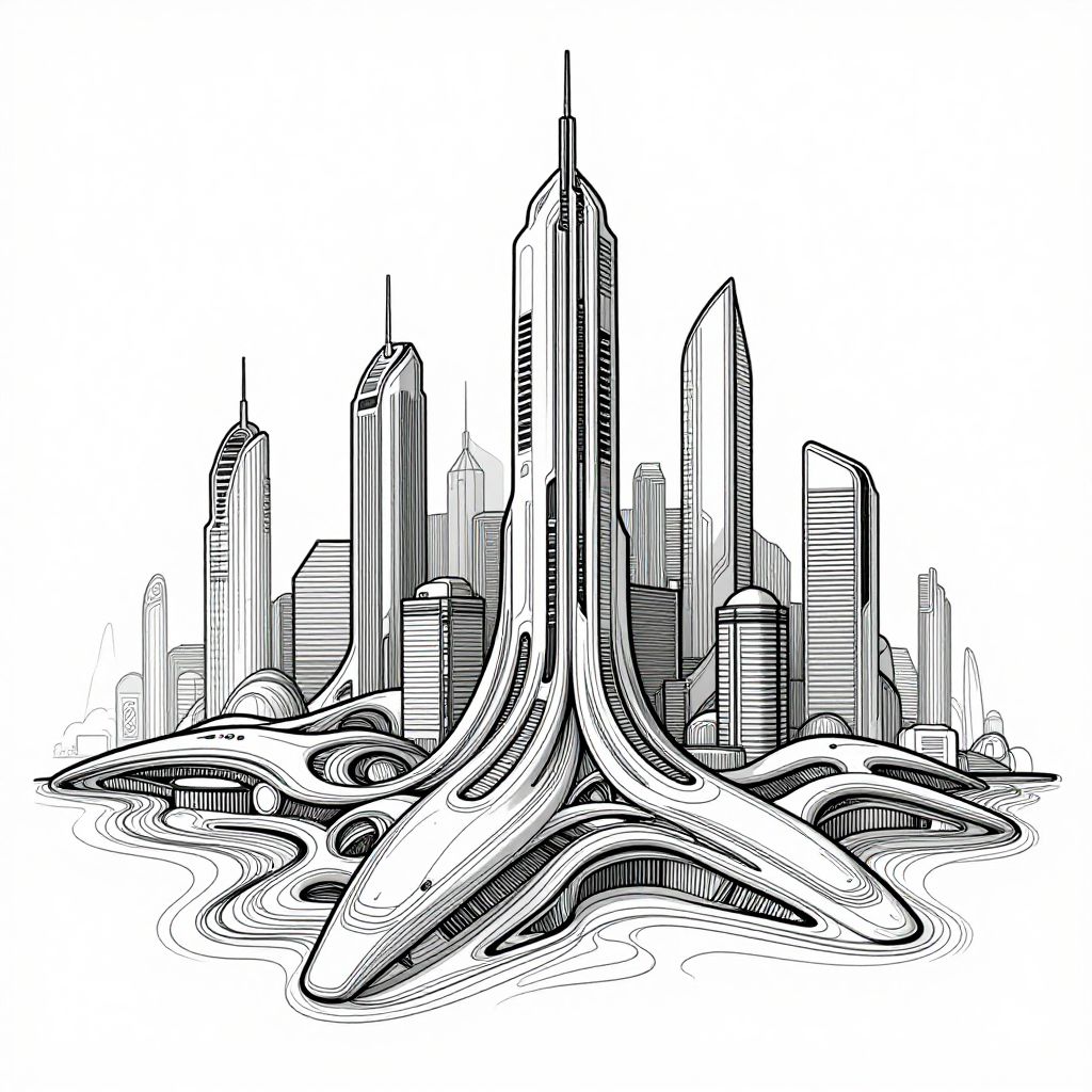 Intricate Futuristic Cityscape Line Art