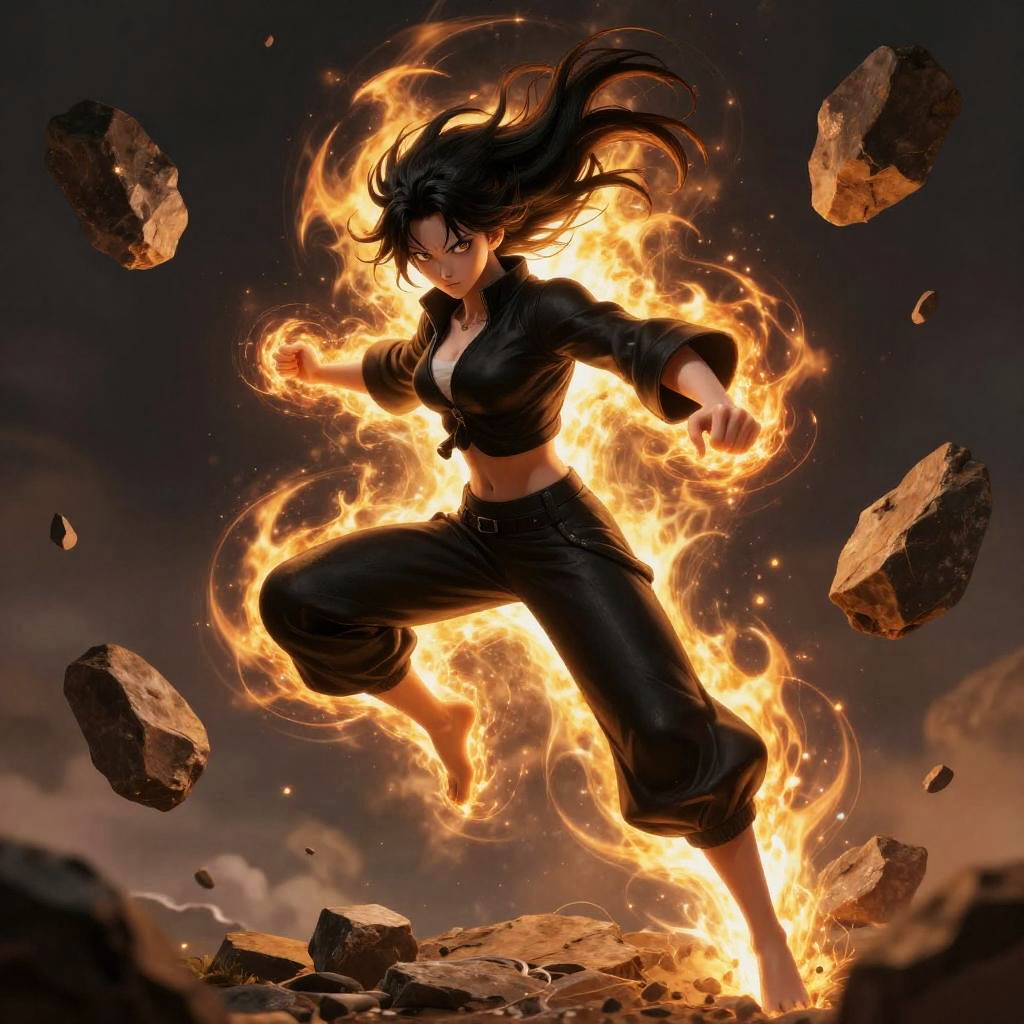 (masterpiece, best quality, very aesthetic, ultra detailed), intricate details, 1girl, tatsumaki, one-punch man, black clothes, aura, floating, floating rock, telekinesis, cinematic angle