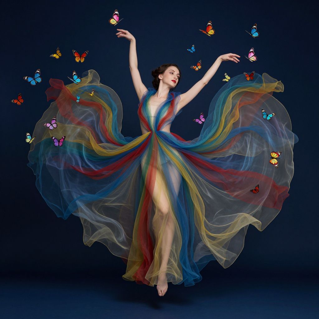 Photograph of a fair-skinned woman in a flowing, multicolored, sheer dress dancing against a dark blue background, surrounded by colorful butterflies.