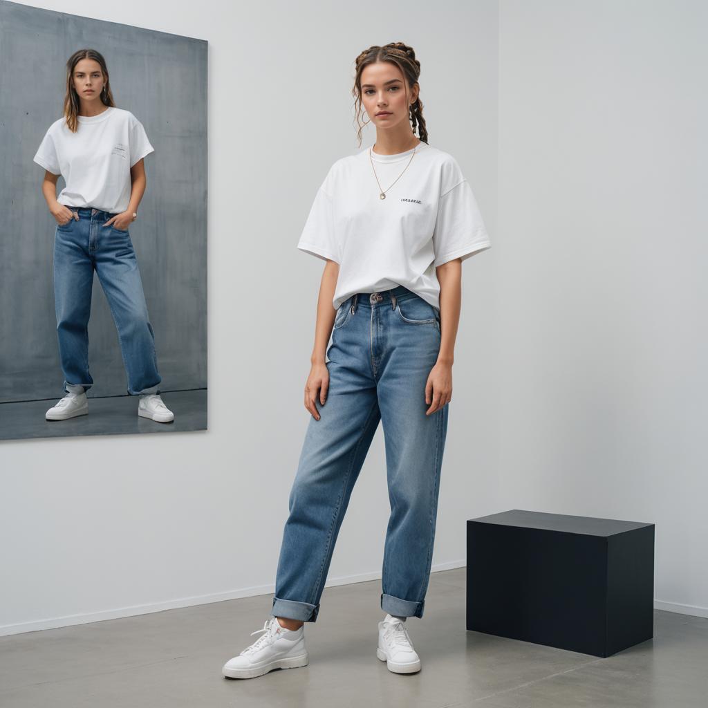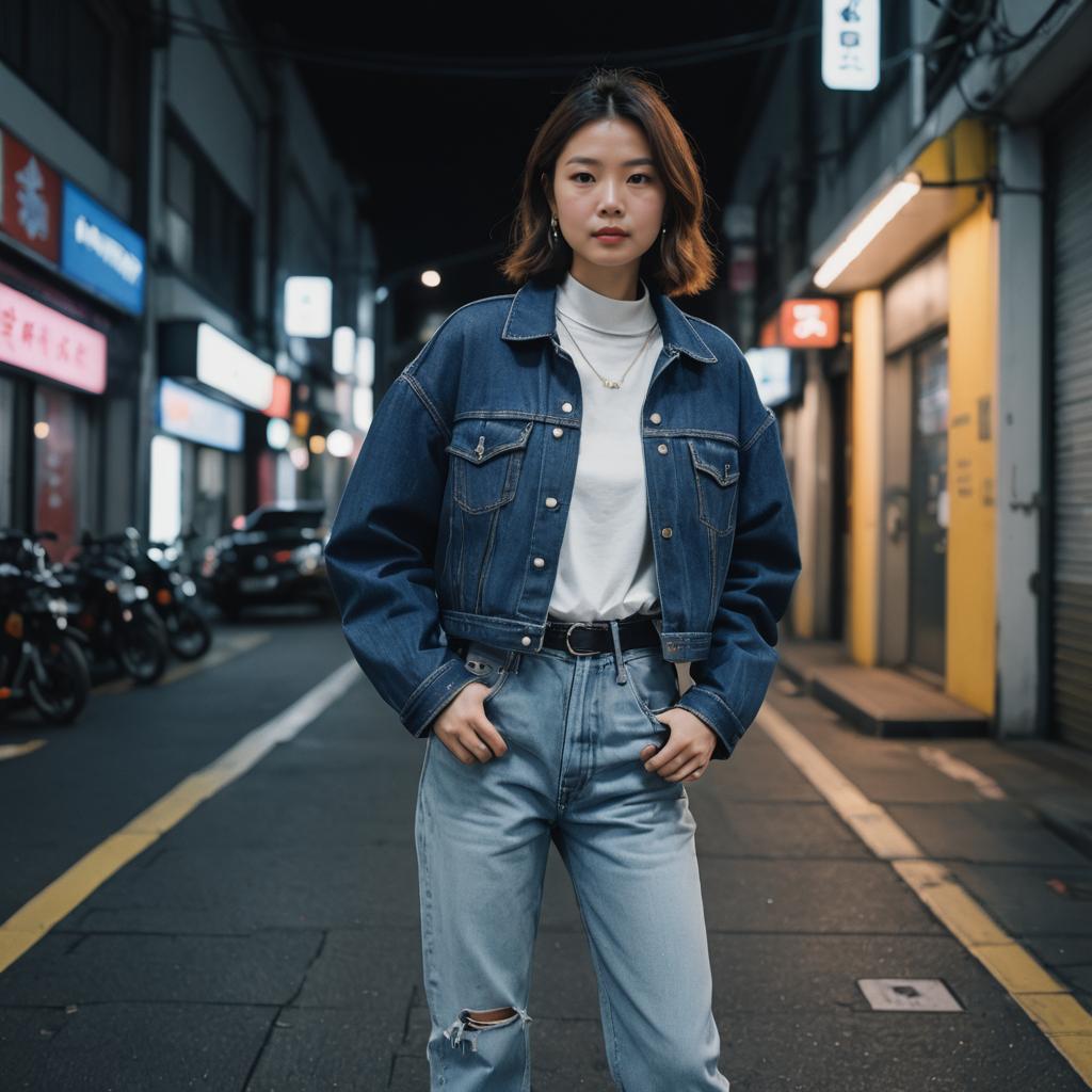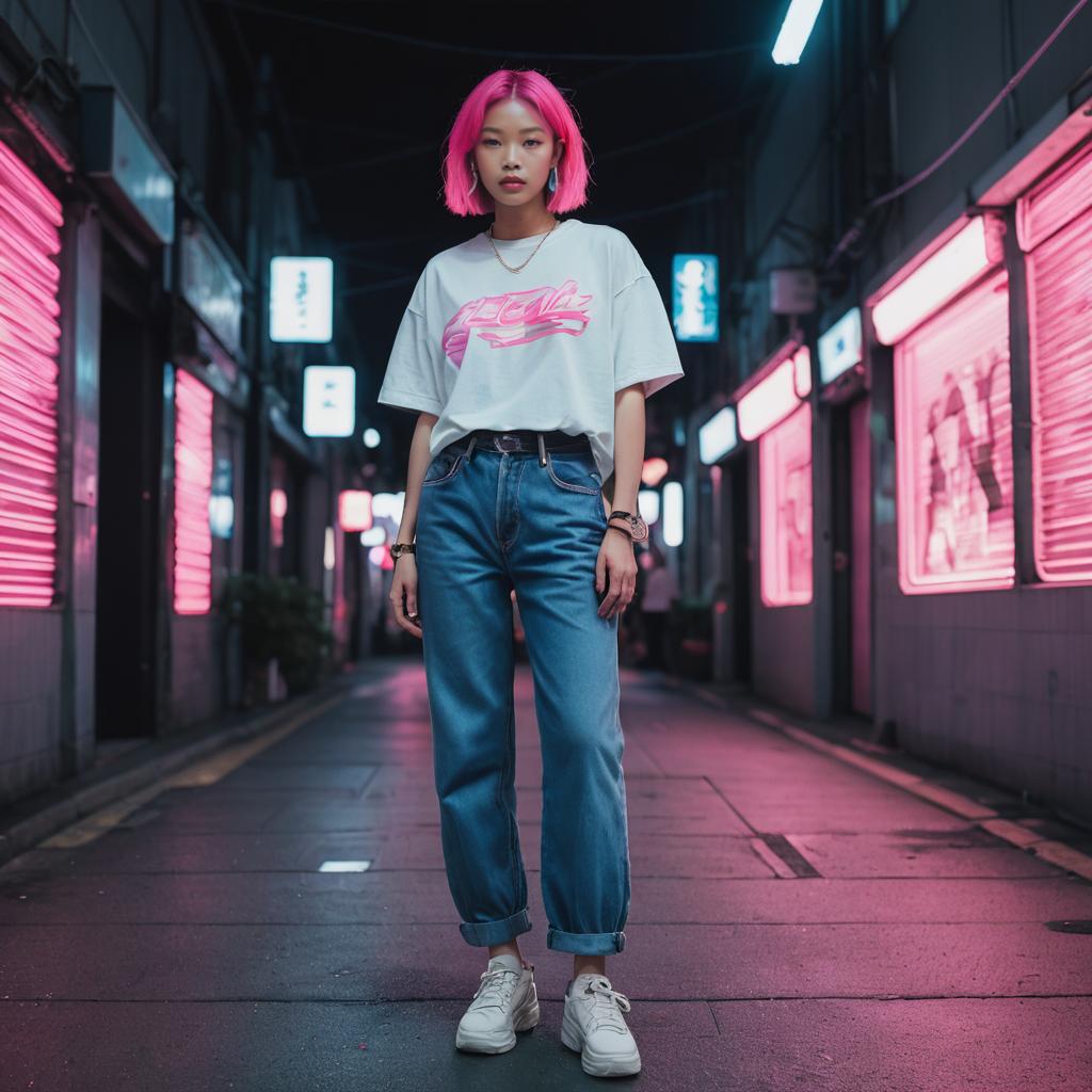 Low Rise Baggy Jeans, full-body woman, big tits, small waist, minimalist studio photograph showcasing a confident silhouette with bright neon pink hair modeling a casual Y2K outfit. The subject wears graphic baby tee in bold colors paired with loose-fitting, light-wash low-rise baggy denim jeans. The scene is a busy Tokyo street crossing at night with neon reflections and clean white walls. Street style, photorealistic, 8k, detailed denim texture.