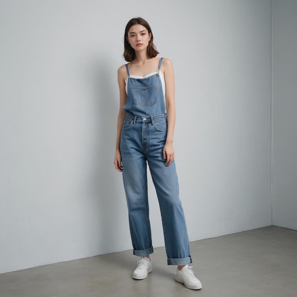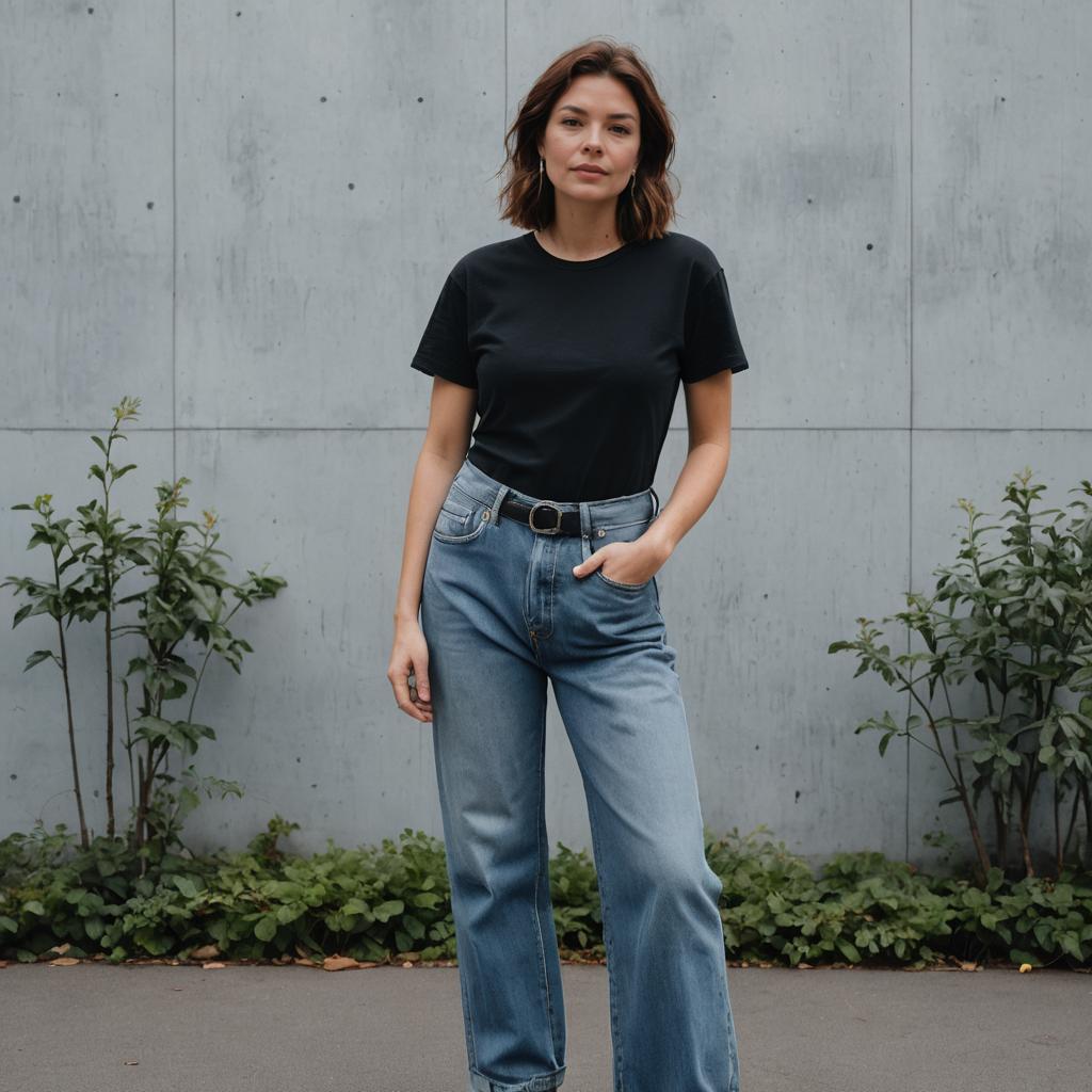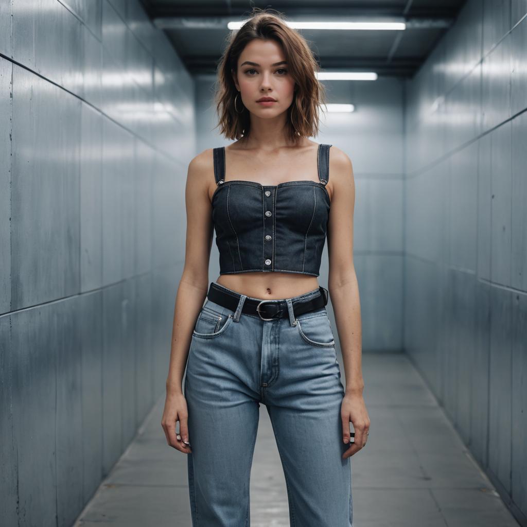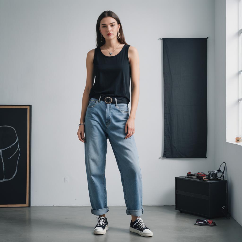 Low Rise Baggy Jeans, full-body woman, big tits, small waist, minimalist studio photograph showcasing a confident silhouette with bright neon pink hair modeling a casual Y2K outfit. The subject wears graphic baby tee in bold colors paired with loose-fitting, light-wash low-rise baggy denim jeans. The scene is a busy Tokyo street crossing at night with neon reflections and clean white walls. Street style, photorealistic, 8k, detailed denim texture.