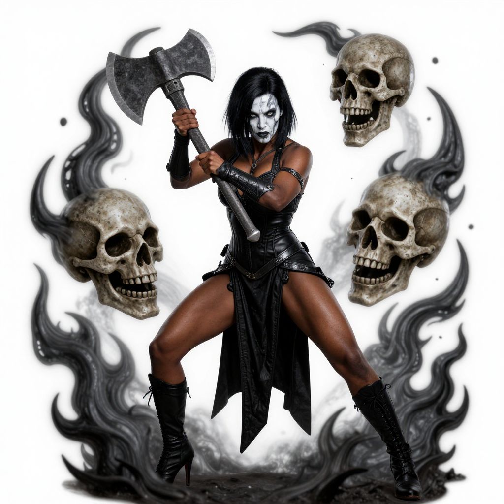 Digitally illustrated woman with white face paint, black leather outfit, and axe, surrounded by floating skulls and black smoke. Dynamic, fierce pose. Dark