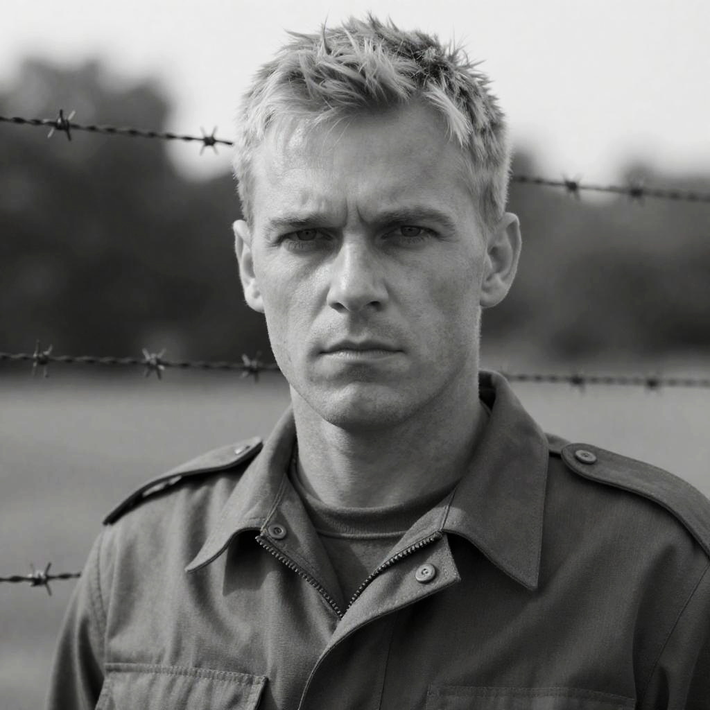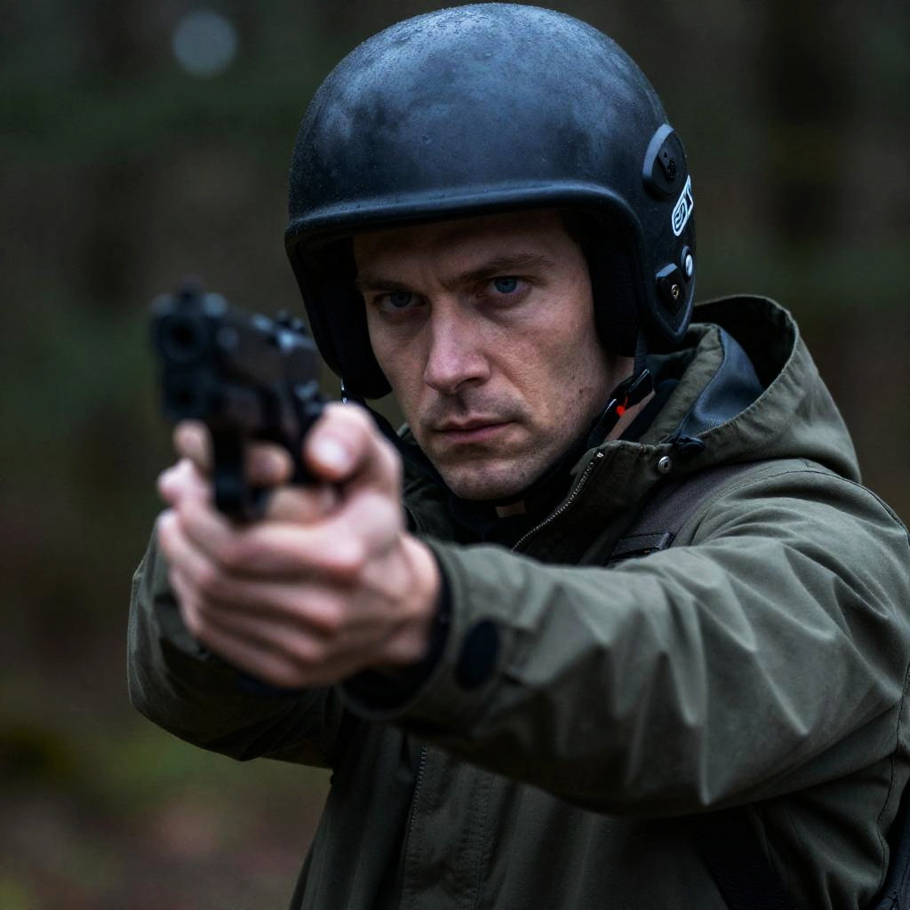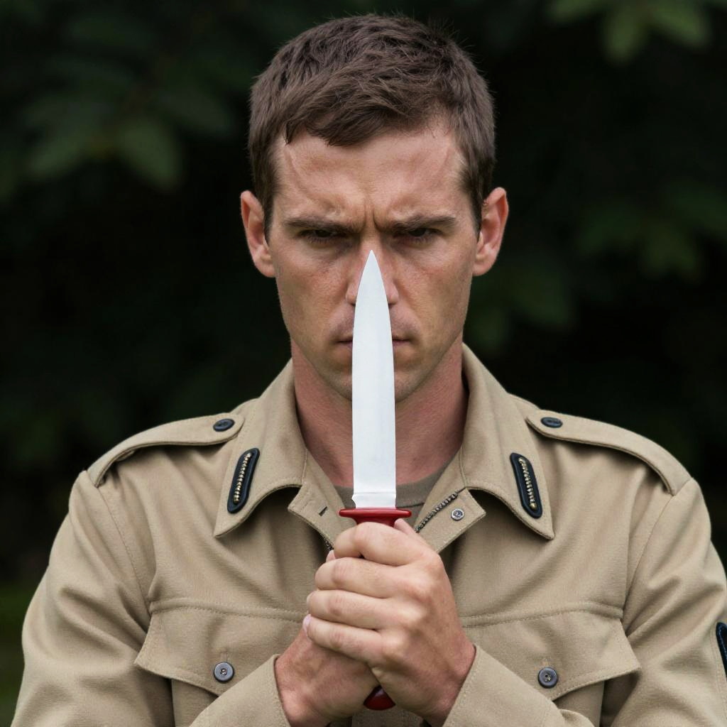 Photograph of a man with short brown hair, wearing a beige military-style jacket, holding a knife with a white blade and red handle, centered in the frame. Dark green foliage background. Man has intense, focused facial expression.