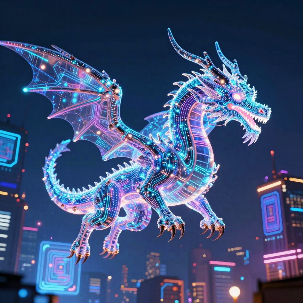 Neon digital artwork of a glowing, pixelated dragon with vibrant blue, purple, and red lights against a black background.