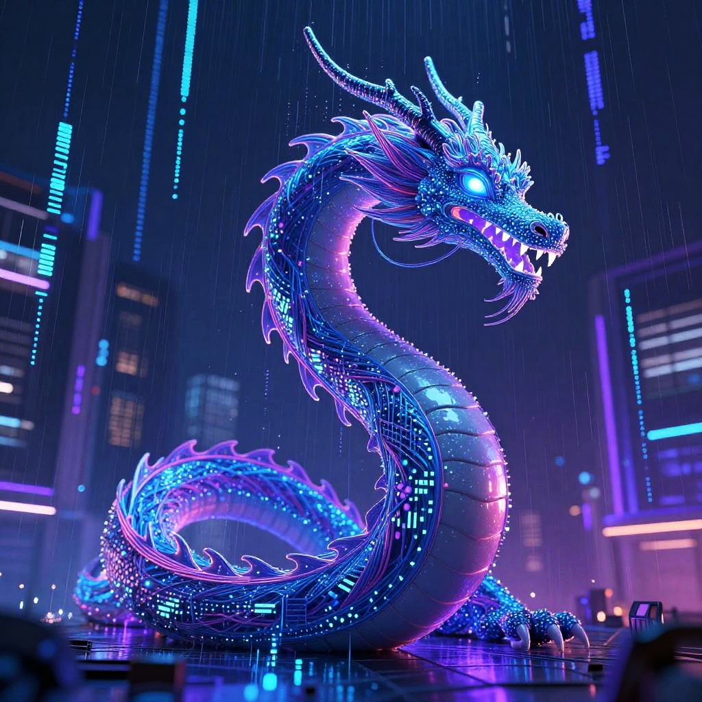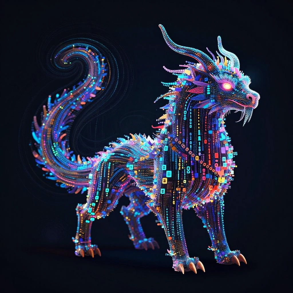 Free digital art representation of a mythical creature formed entirely from swirling pixels and binary code strands, colors shifting dynamically, dark background highlighting luminescent elements, a fusion of technology and fantasy in a captivating digital masterpiece.