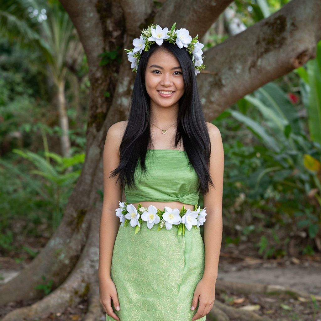 A young Asian woman wearing a traditional green hula dress stands outdoors near a large tree. She has long black hair adorned with a white flower crown and a matching flower belt. The background features lush greenery, emphasizing a natural, tropical environment. The woman is smiling and looking at the viewer.