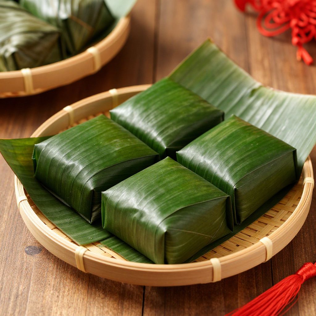 Banh chung traditional Vietnamese square sticky rice cake wrapped in green banana leaves, festive Tet holiday setting, wooden table with bamboo basket, natural daylight, cultural heritage, elegant rustic style, fine details