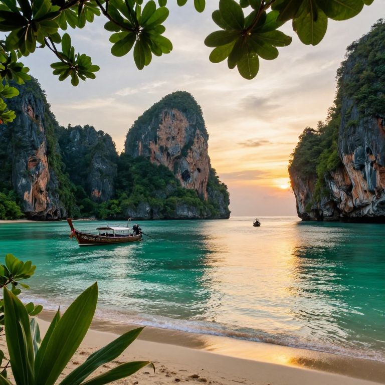 Photograph of a tranquil tropical beach at sunset, featuring a traditional long-tail boat on turquoise waters, surrounded by limestone cliffs and framed by green leaf