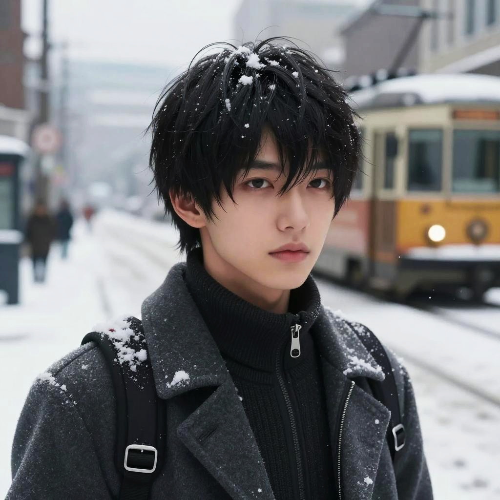 Snow, tram, street, (masterpiece), ((ultra-detailed)), (highly detailed CG illustration), (expressionless), (best quality:1.2), High quality texture, intricate details, detailed texture, High quality shadow, Cinematic Light, Depth of field, light source contrast, perspective, 20s, (ulzzang-6500-v1.1:0.5)