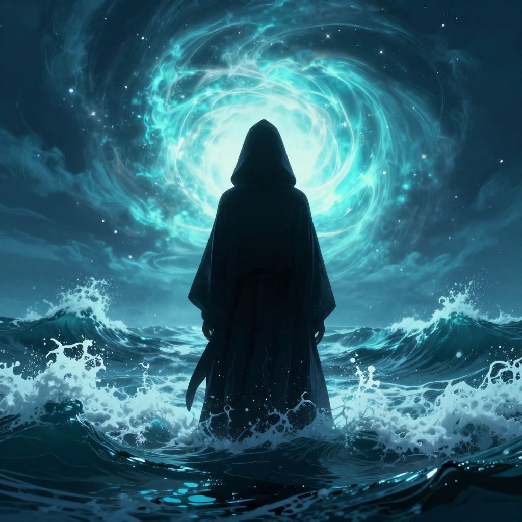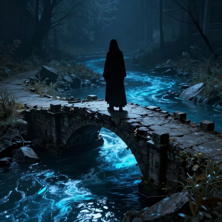 Takepoison as a shadowy figure standing on a crumbling stone bridge over a toxic river, neon-blue liquid reflecting on water, mysterious ambiance, high contrast, cyberpunk fantasy fusion, MidJourney style