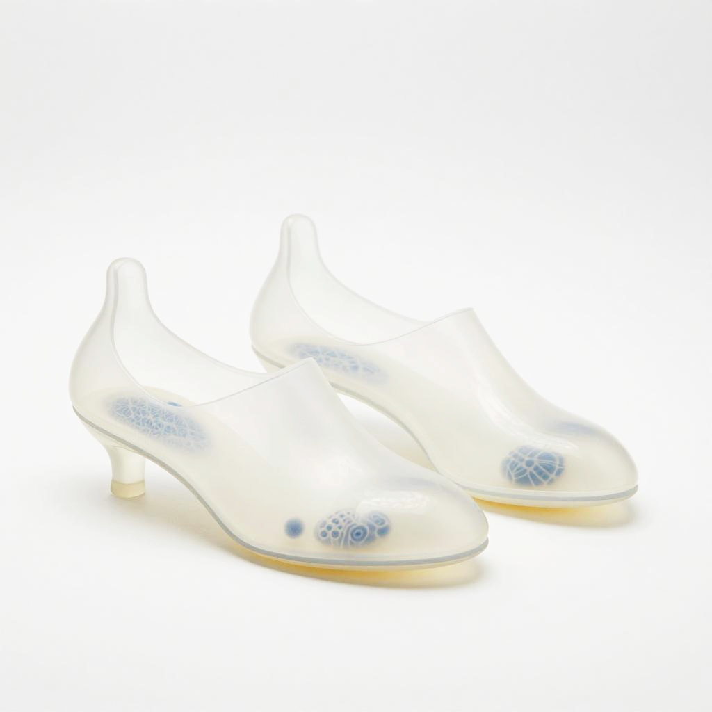 Innovative sperm shoes on a minimalist white background, emphasizing the unique sperm-shaped heels and soles, made of translucent materials with subtle biological patterns and a futuristic aesthetic.