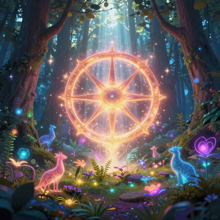 This digital fantasy artwork depicts a magical forest illuminated by a glowing, orange and yellow, luminous compass set against a backdrop of towering trees. The forest floor is adorned with vibrant, bioluminescent creatures, including glowing deer and flowers, in hues of pink, blue, purple, and green. Star-like sparkles dot the scene, enhancing the mystical atmosphere. Sunlight filters through the dense canopy, highlighting the compass's radiant design. The texture of the trees and foliage is rich and detailed, creating a lush, enchanted woodland setting.
