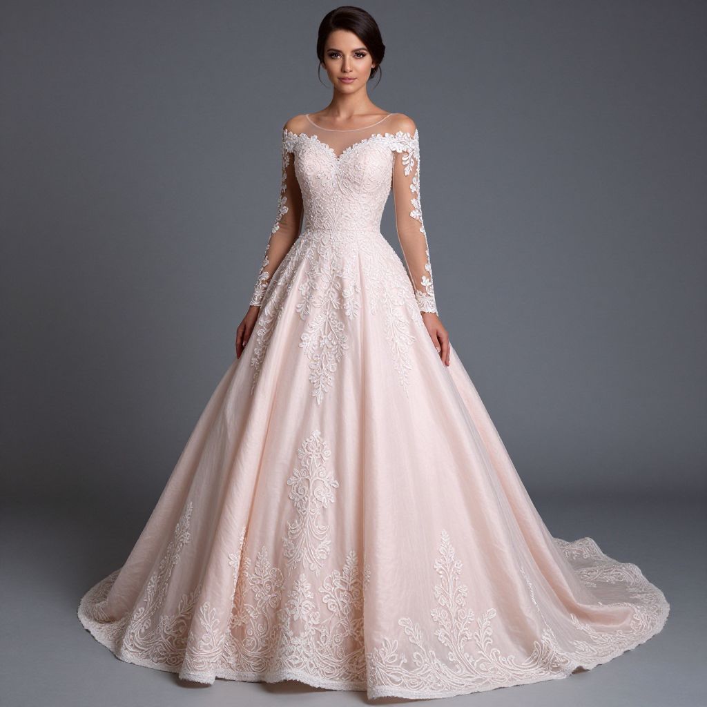Elegant woman showcasing a stunning 2019 Dubai Arabic wedding dress featuring lace appliqués and off-the-shoulder sleeves, paired with a flowing pink ball gown accentuated by intricate embroidery and a sheer bodice.