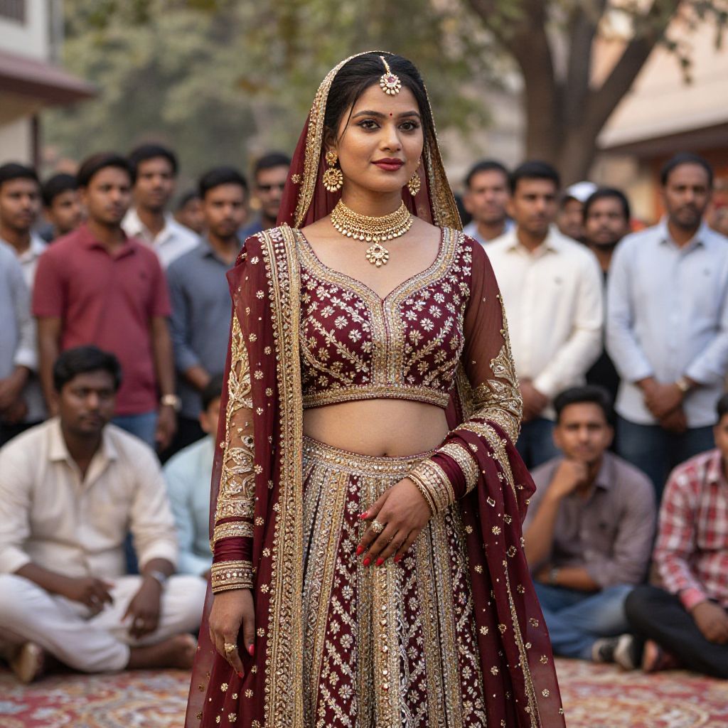 Best prompt for Indian girl: A confident Indian girl with braided hair wearing a colorful hand-embroidered lehenga, sitting on a rooftop in a bustling Indian city at sunset, city skyline in the background with neon lights reflecting on the street, cinematic lighting, high detail, rich colors, authentic cultural setting.