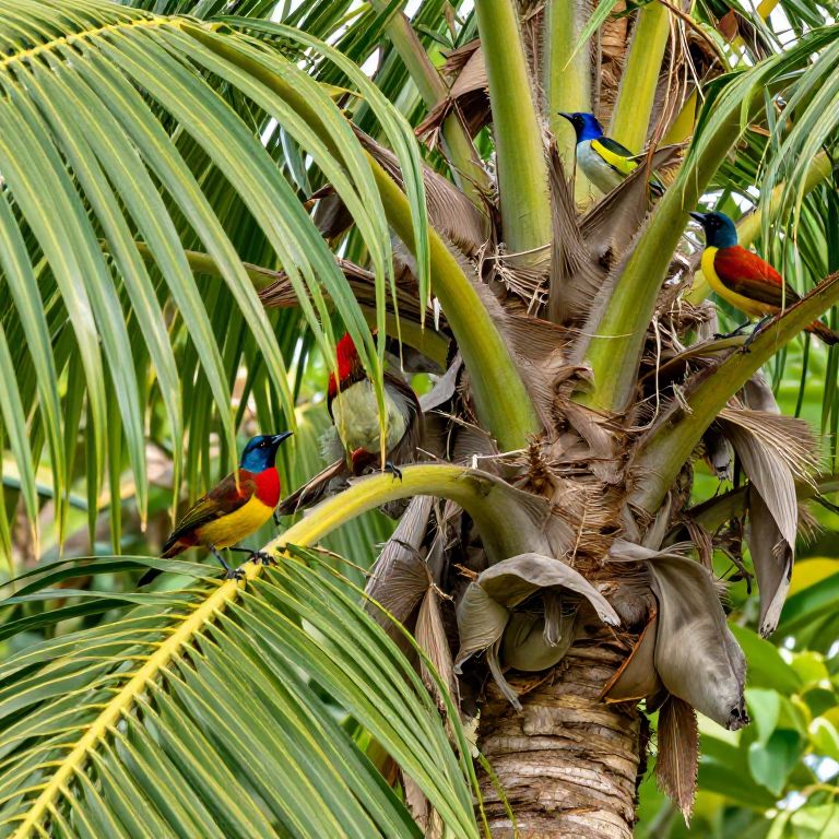 Close-up of a palm tree trunk and leaves with tropical birds perched, bright green foliage and textured bark, birds in vivid colors, soft natural light highlighting details, lively and dynamic wildlife moment captured in high resolution