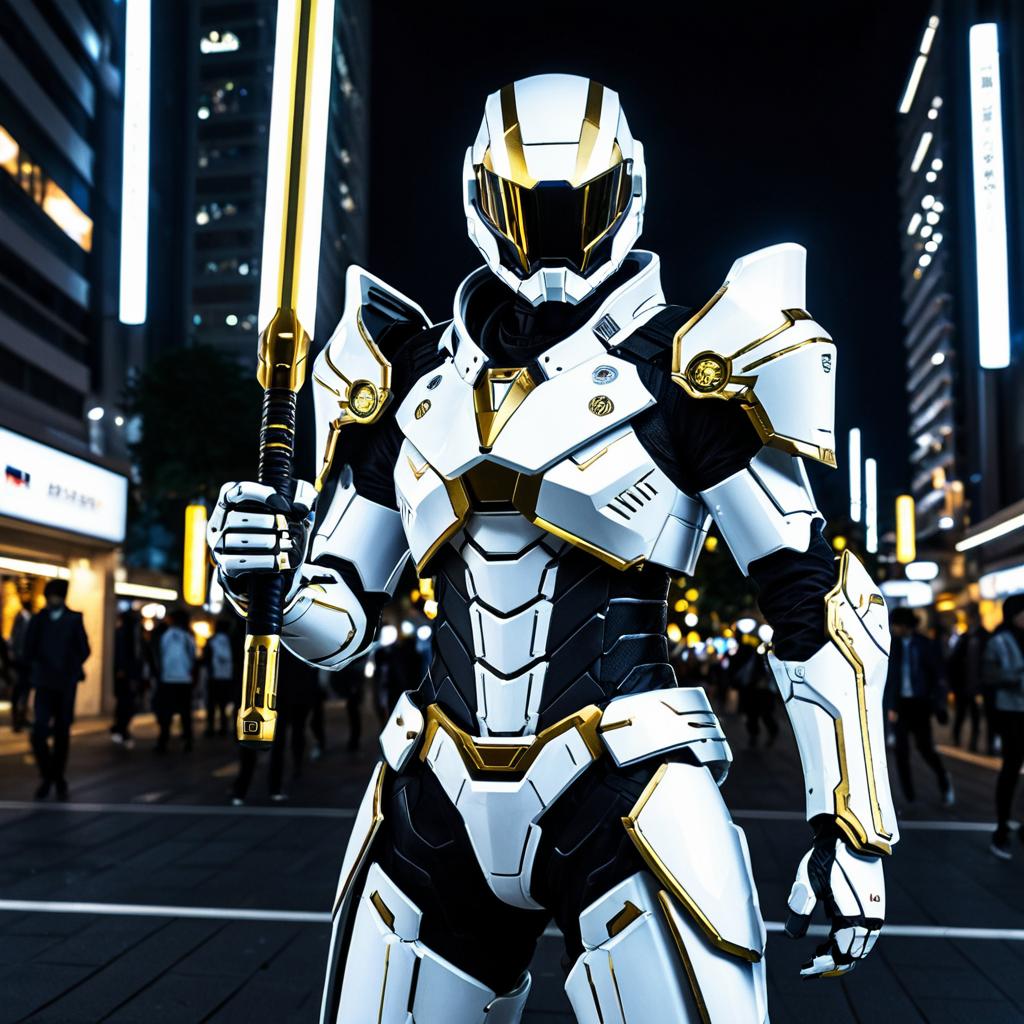 An android peacekeeper, wearing sleek white reflective armor with gold trims, holding a high-frequency energy baton, in a neon-lit urban plaza at night, illustrated in the dark and hyper-realistic anime style of Hiroya Oku.
