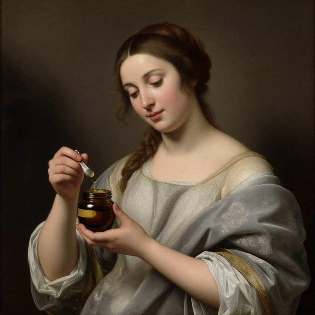Baroque-style painting of a fair-skinned woman with brown hair, wearing a white and gray patterned dress, opening a small jar of honey.