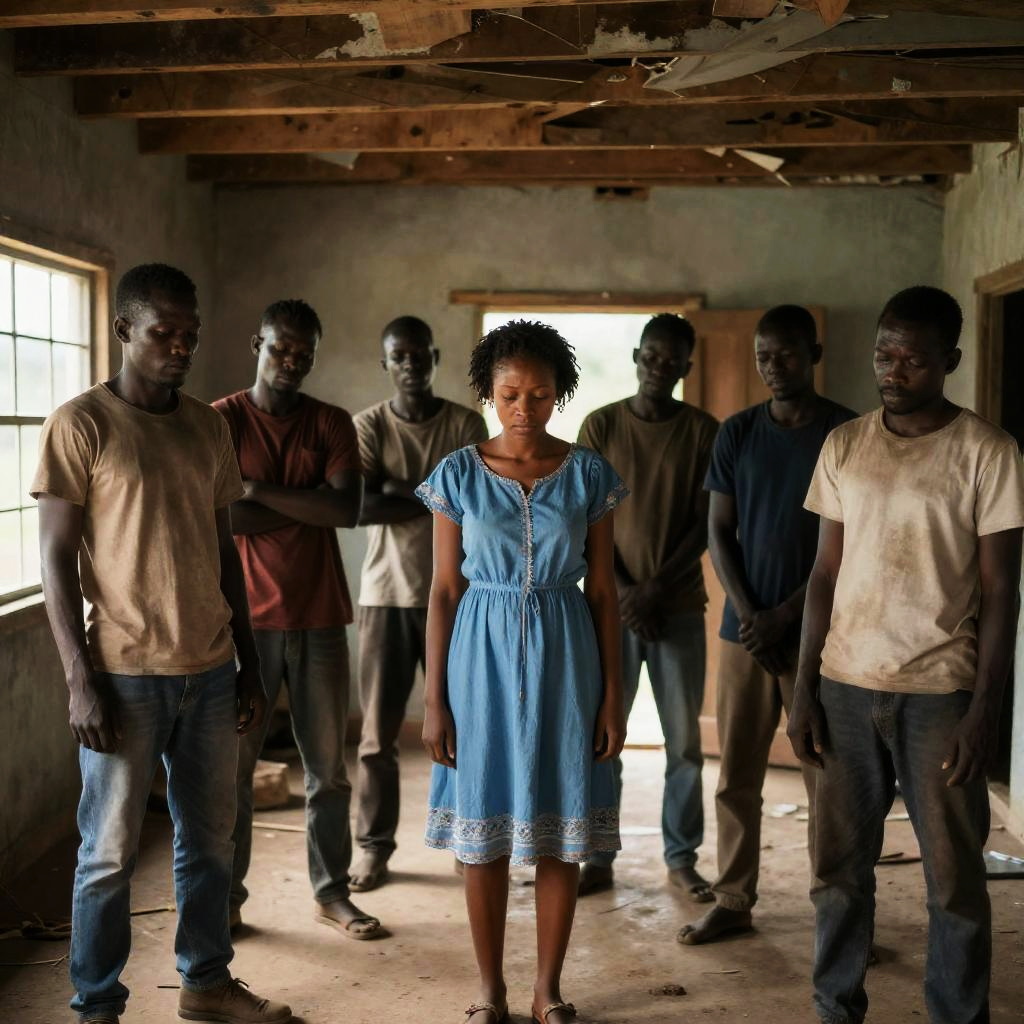 Photograph of six Black people standing in a dilapidated wooden room. Five men, one woman. Woman in center wearing blue dress, others in worn clothing. Wooden ceiling, broken plaster, and debris. People standing in a line, looking down or to the side. Natural light from small windows. Casual, somber expressions.