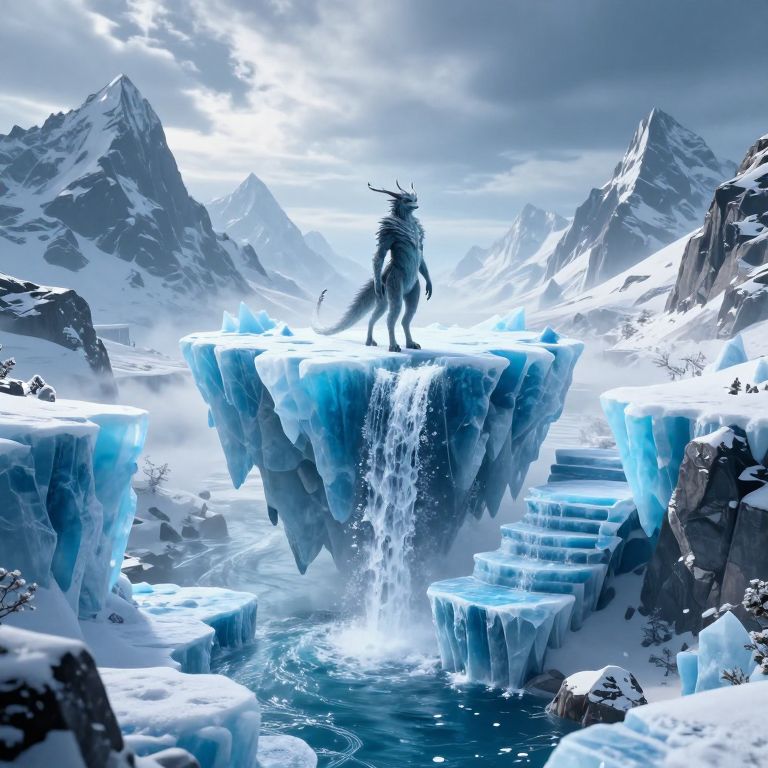 In a surreal, high-definition 3D-rendered landscape, a mythical creature stands atop a floating iceberg as a cascading river of ice forms staircased platforms, evoking forgotten myths against a backdrop of rugged, snow-capped mountains under dramatic lighting.