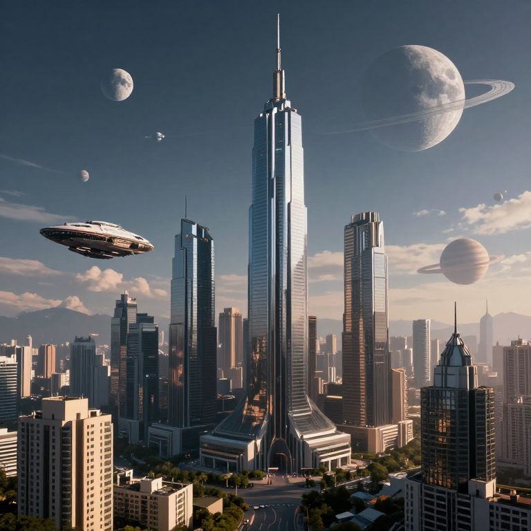 A futuristic cityscape with towering buildings, a floating spaceship, and a surreal, otherworldly sky with multiple moons and planets.