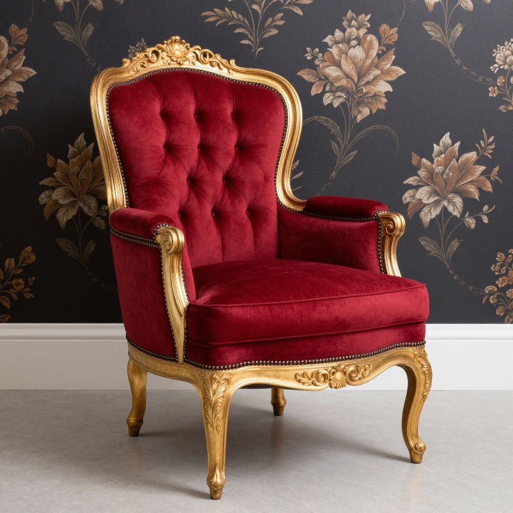 Photograph of a luxurious, vintage-style armchair with a rich, deep red velvet upholstery featuring tufted back and seat. The chair has an ornate, gold-painted wooden frame with intricate carvings, including elaborate scrollwork on the arms and legs. The chair's edges are trimmed with black nailhead. The background is a dark blue wallpaper adorned with large, gold floral patterns, adding a regal contrast to the vivid red of the chair. The floor is a light gray, smooth surface, and the image is well-lit, highlighting the chair's textures and details.