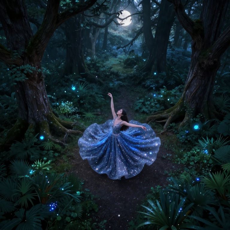 An image showcasing the enchanting dance of an ethereal figure in a tranquil nocturnal landscape, reminiscent of Romanticism's captivating allure. The celestial being gracefully moves across a meadow bathed in silver light, her glistening wings reflecting every subtle motion as if crafted from shimmering starlight. Captured from above, this scene encapsulates the serene and mysterious ambiance of twilight, evoking feelings of awe and contemplation. The whimsical atmosphere is heightened by the gentle interplay of moonlit beams filtering through wisps of mist, highlighting the luminous presence of the dancer and casting elongated shadows over the rich, verdant surroundings.