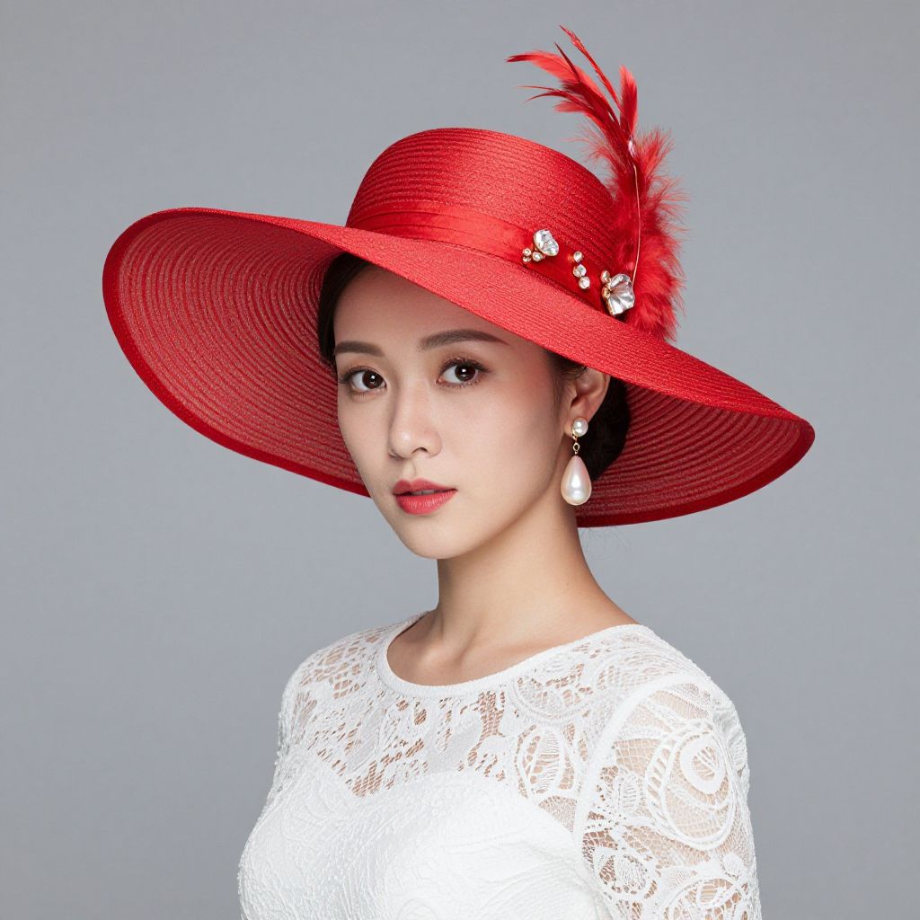 Woman wearing a wide-brimmed red wedding hat adorned with a feathered embellishment, paired with a white lace dress and pearl earrings, exudes elegance against a plain background.