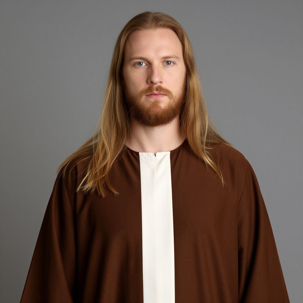 Photograph of a Caucasian man with long, straight, light brown hair and a full beard, wearing a brown robe with a white vertical stripe down the front. He has blue eyes and a fair complexion. The background is a plain, gradient gray. The man's expression is neutral, and he looks directly at the camera. The lighting is even, highlighting his features and the texture of his robe. The image has a realistic, studio portrait style.
