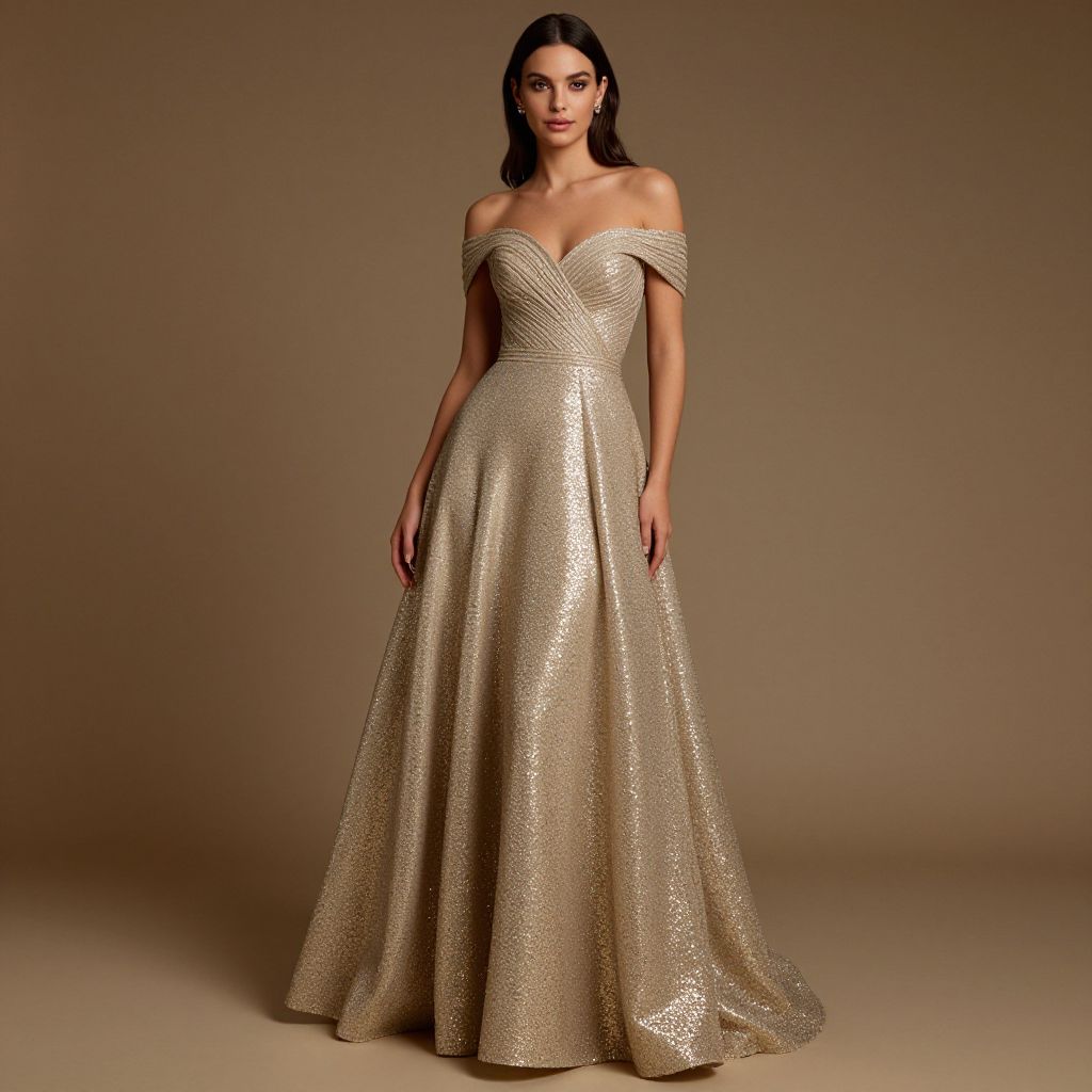 Elegant woman showcasing a shimmering LSS107 luxury Dubai golden glitter ball gown with an off-the-shoulder sweetheart neckline, accentuating her curves against a warm, neutral backdrop.
