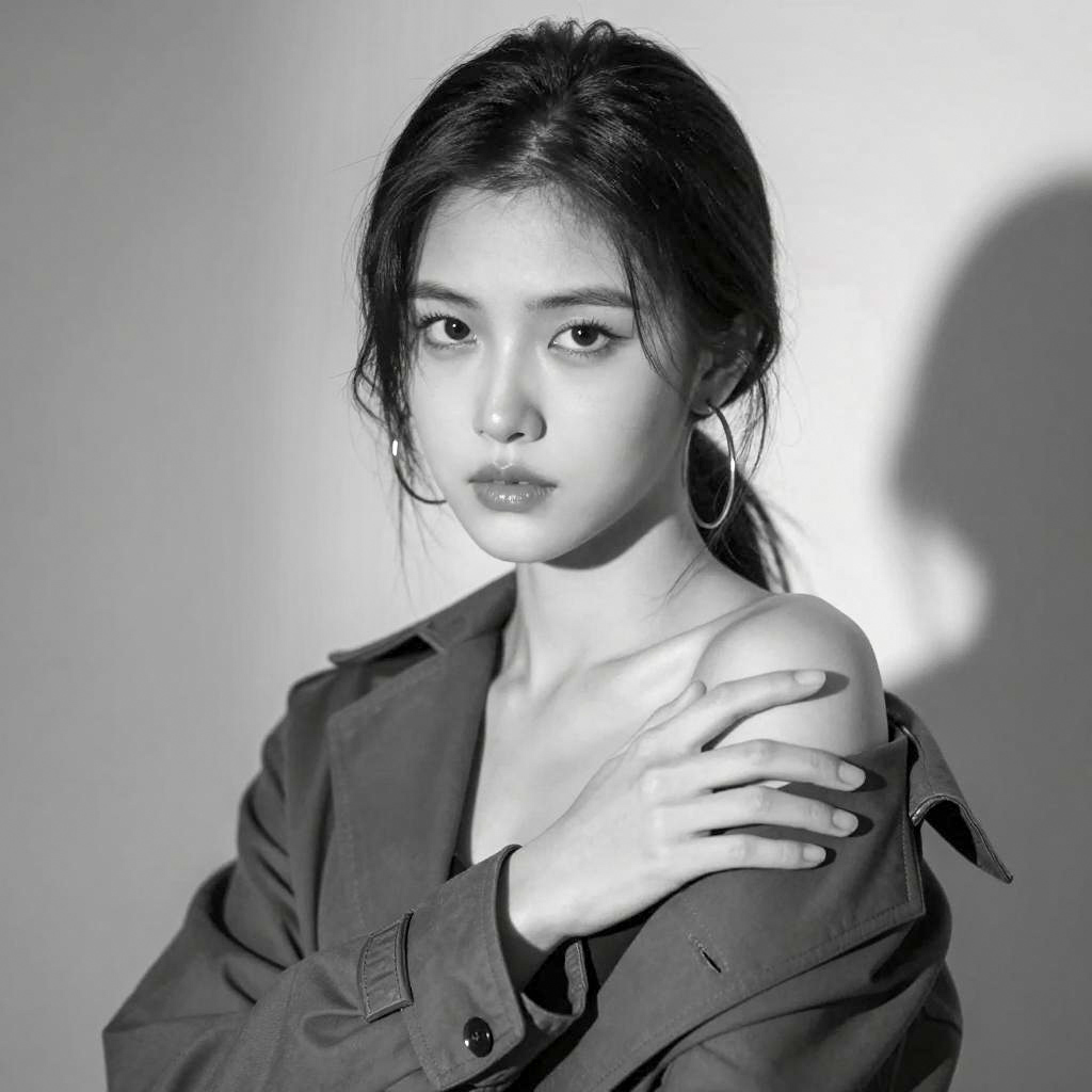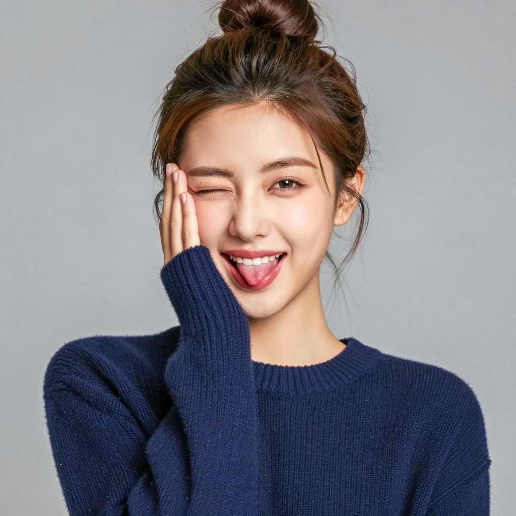 Asian woman with long black hair, winking, holding a green, googly-eyed object in her mouth. Wearing white sleeveless top, silver chain necklace, black shoulder strap. Background: blue and green abstract mural. Hand with rings visible. Bright daylight.