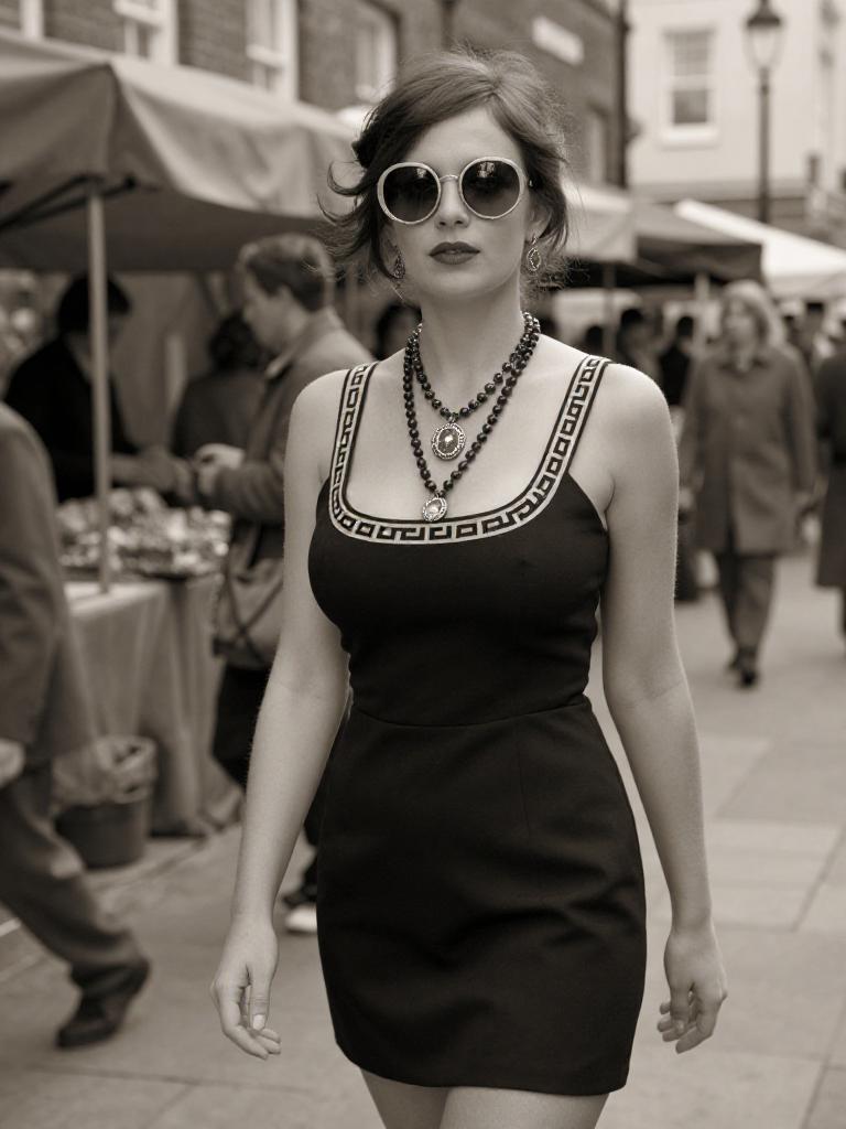 A woman in a chic black sleeveless mini dress with geometric neckline trim and a statement necklace, oversized round sunglasses, captured in a sepia effect at a 1920s street market in London. Sexy. Pretty face and beаutiful eyes. Big breasts