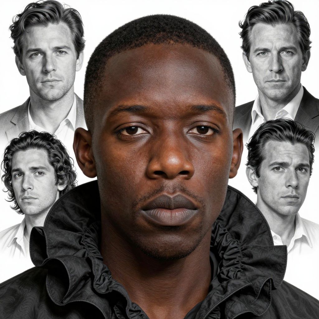 Photograph collage featuring a central close-up of a Black man with short, curly hair, dark skin, and a serious expression, wearing a black jacket. Surrounding him are five grayscale portraits of a white man with wavy hair, wearing white shirts, displaying serious and contemplative expressions. The background is white, highlighting the contrast between the black central figure and the grayscale portraits. The image blends realistic and photographic styles, focusing on facial expressions and textures.