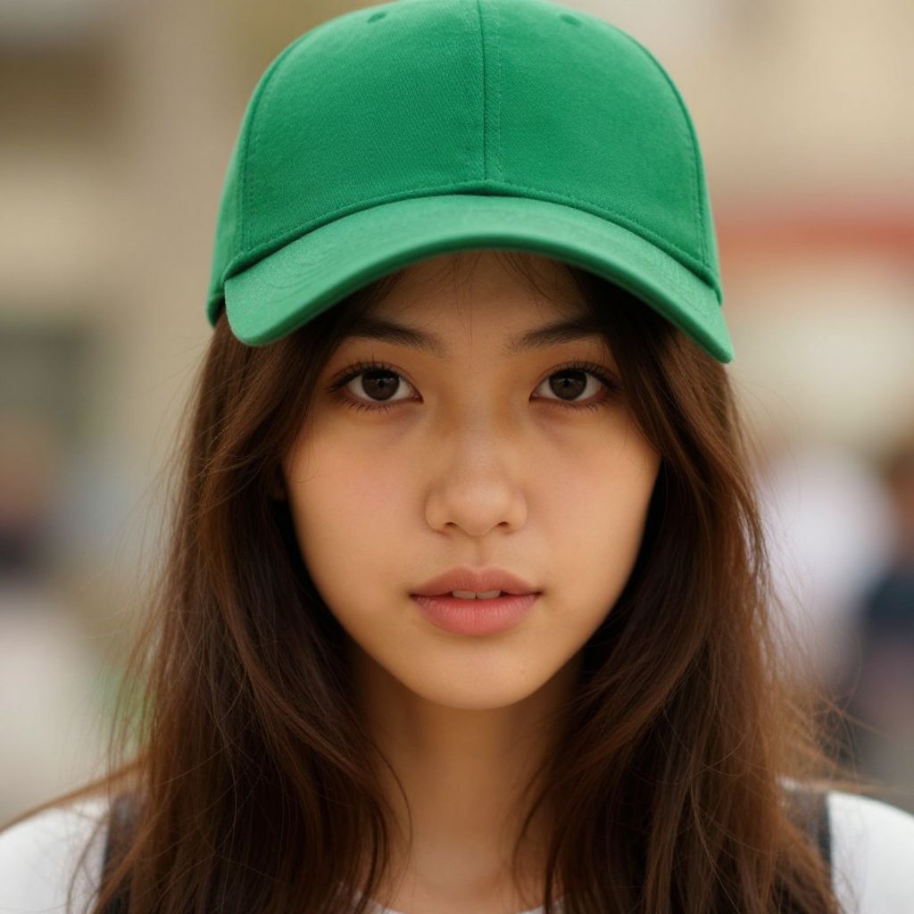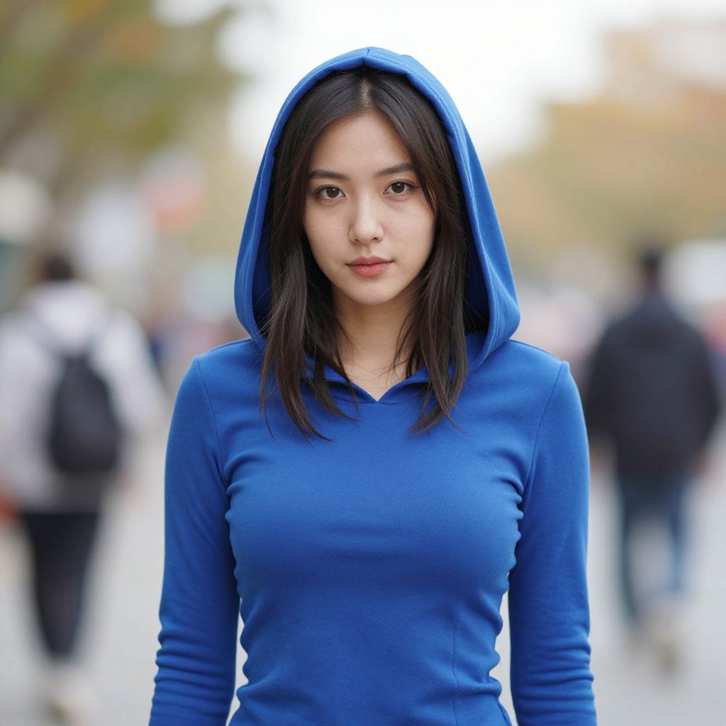 Photograph of an Asian woman with straight black hair, wearing a blue hoodie with the hood up, standing in a blurred urban street background.