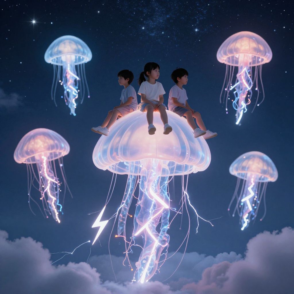 A whimsical scene unfolds as children perch atop ethereal jellyfish-shaped clouds, their translucent bodies glowing softly against the starlit sky, while cascading lightning bolts dance playfully below, defying the boundaries of gravity and reality.