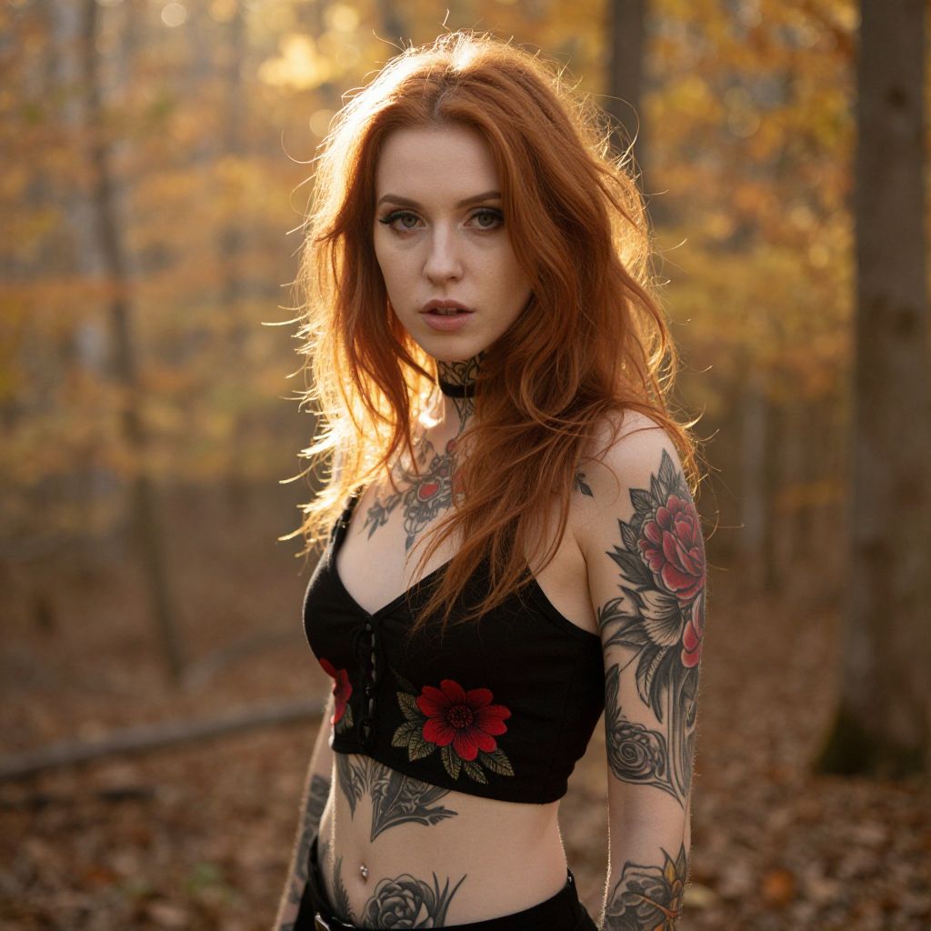 A photograph of a fair-skinned woman with vibrant red hair sitting outdoors on dry grass. She's heavily tattooed with colorful, intricate designs covering her arms, shoulders, and back. She's wearing a red, lace-like, sleeveless top that partially exposes her tattoos. She's in profile, resting her chin on her hand, looking off to the side. The image has a slightly over-saturated, dreamy effect.