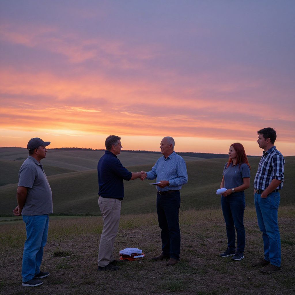 Landman negotiating with local landowners near rolling hills and farmland, handshake moment, vibrant sunset sky, capturing human interaction and natural landscape in a semi-realistic style