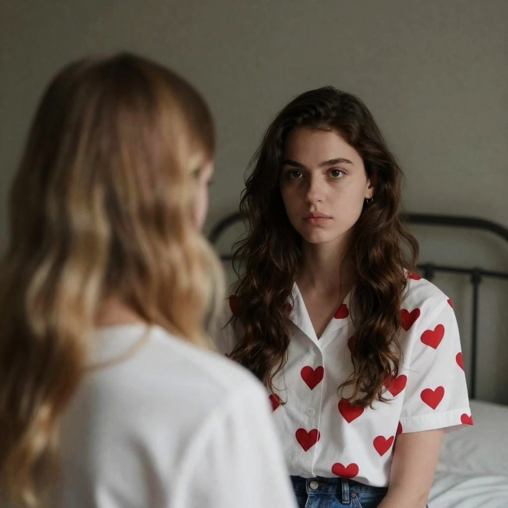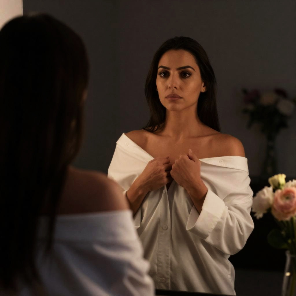Photograph of a man and woman in front of an ornate mirror. The man, with dark hair in a suit, faces the woman with long brown hair in a black top. The woman's reflection shows a serious expression. The mirror has an elaborate gold frame. The man's back is to the camera.