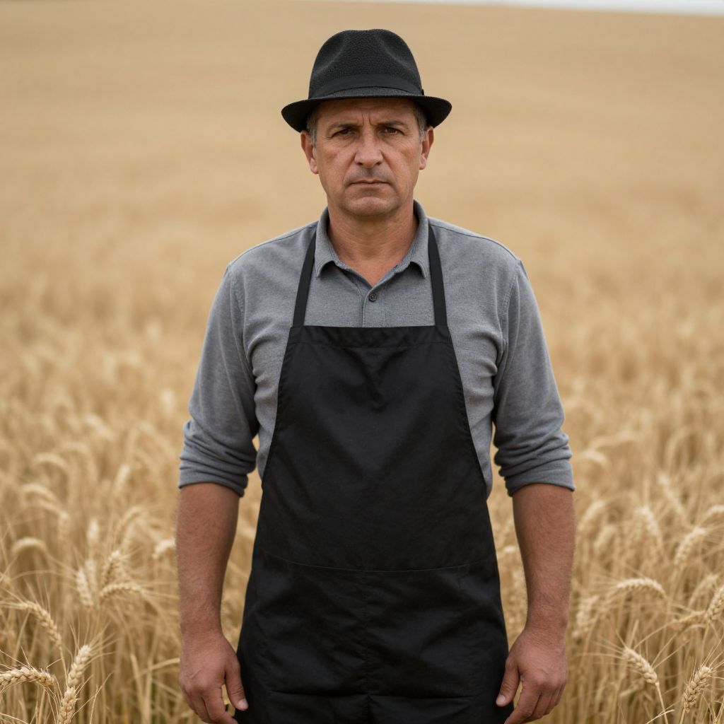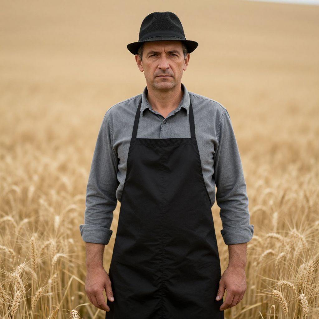 Photograph of a middle-aged man standing in a golden wheat field. He has a serious expression, light skin, and short dark hair. He's wearing a black fedora, gray long-sleeve shirt, and a black apron over it. The background is a blurred wheat field, creating a warm, earthy tone. His hands are relaxed by his sides, and the overall vibe is rustic and calm.