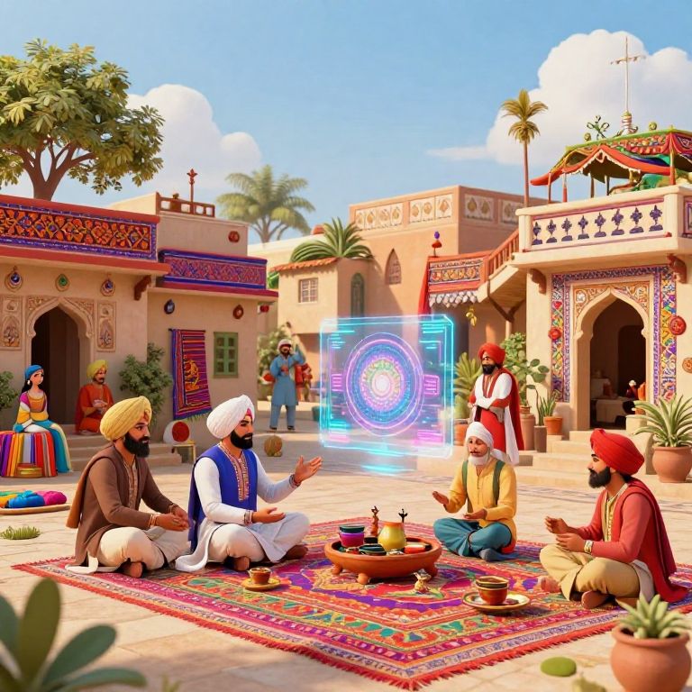 AI Punjabi prompt generating a vibrant, modern digital art scene in a Punjab-style village, with traditional motifs, colorful textiles, and floating AI holograms interacting with local farmers and artisans in a blend of ancient and futuristic elements.