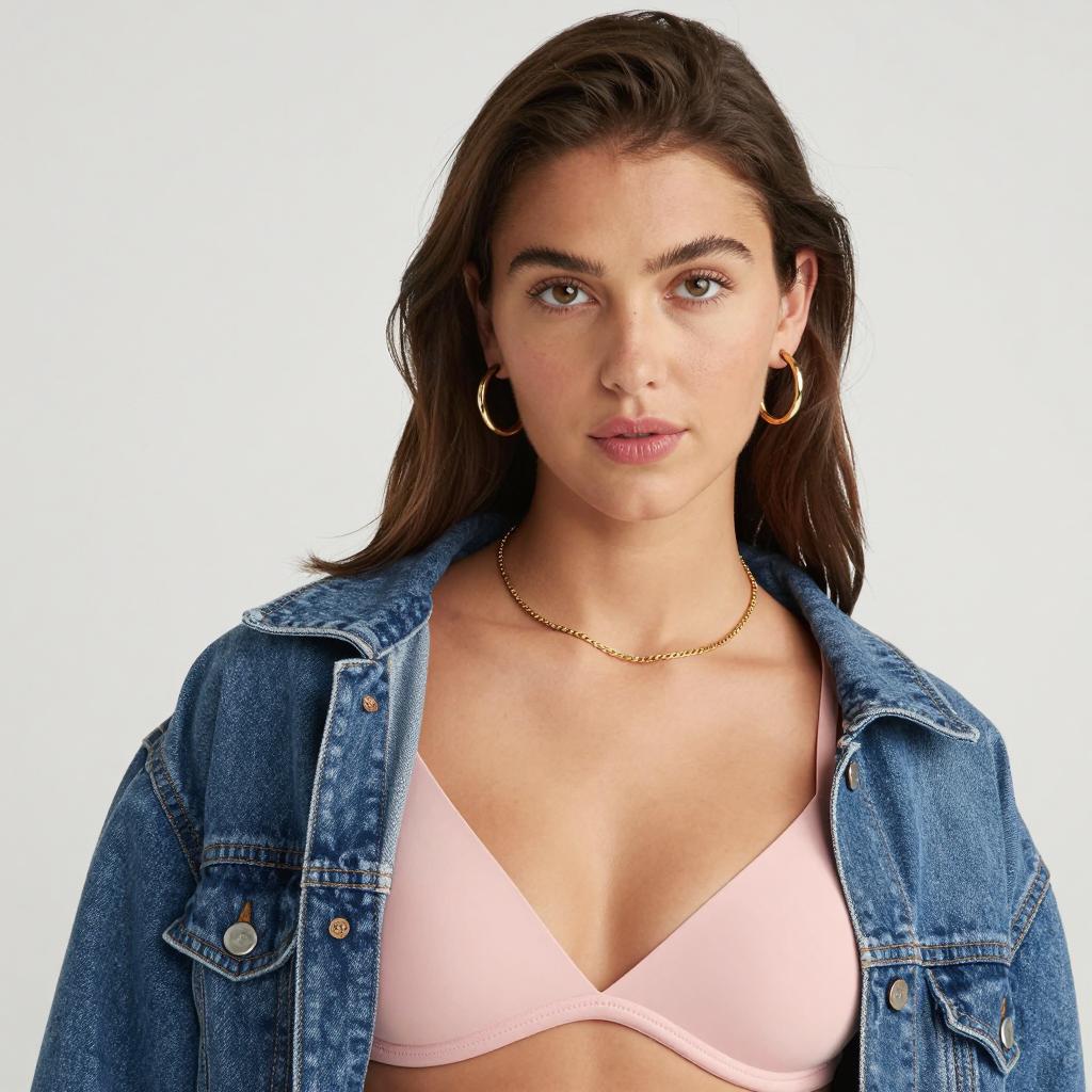 Portrait of a young light-skinned woman with long brown hair wearing a light pink bra and an unbuttoned blue denim jacket. She accessorizes with gold hoop earrings and a thin gold chain necklace. The woman sits with her left hand raised, looking directly at the camera with a neutral expression against a plain white background.