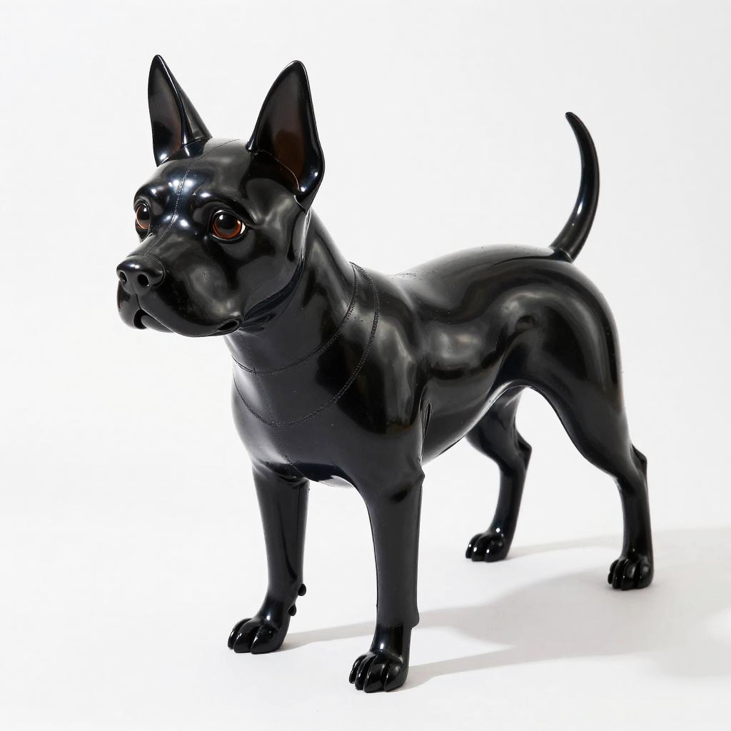 Latex dog costume, sleek and shiny latex texture with detailed dog facial features, high gloss finish, playful and energetic pose, strong shadows, vibrant color scheme