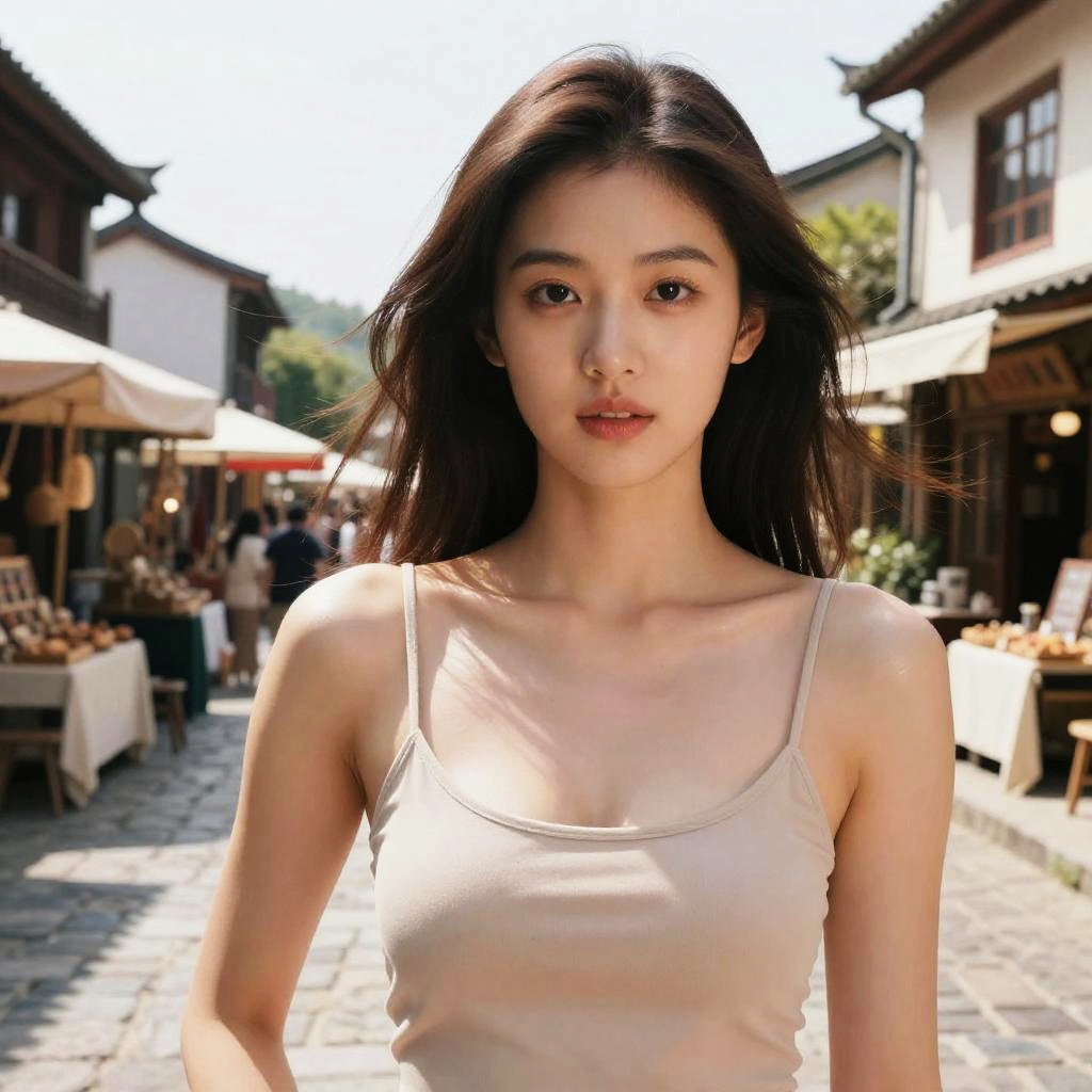 Photograph of a woman with dark, wavy hair, pale skin, and intense gaze, wearing a low-cut top, seated against a dark wooden chair, with a blurred background. Her right arm rests on a table.